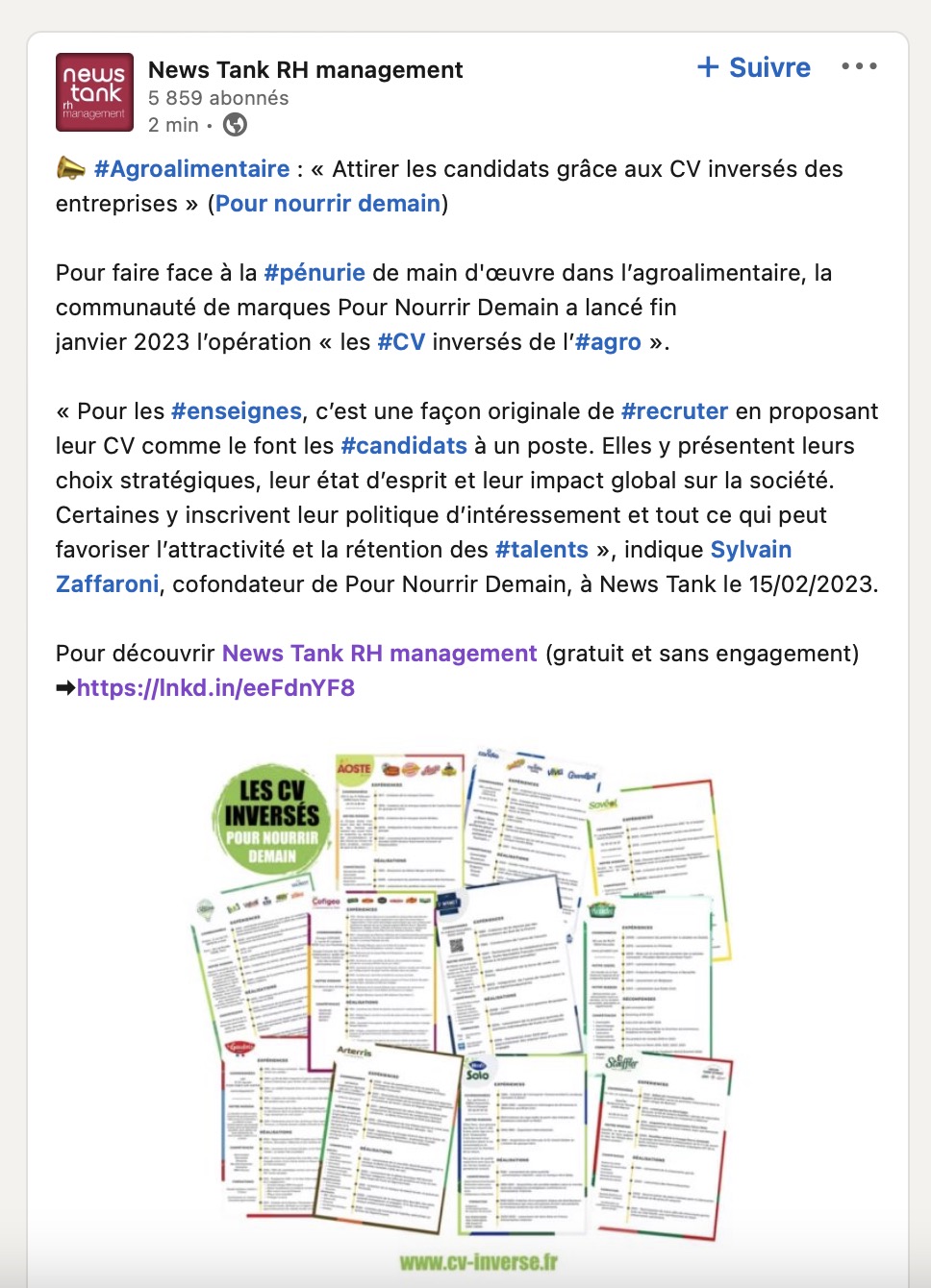 « Pour les enseignes, c’est une façon originale de recruter en proposant leur CV comme le font les candidats à un poste. Elles y présentent leurs choix stratégiques, leur état d’esprit et leur impact global sur la société. Certaines y inscrivent leur politique d’intéressement et tout ce qui peut favoriser l’attractivité et la rétention des talents », indique Sylvain Zaffaroni, cofondateur de Pour Nourrir Demain, à News Tank le 15/02/2023.
