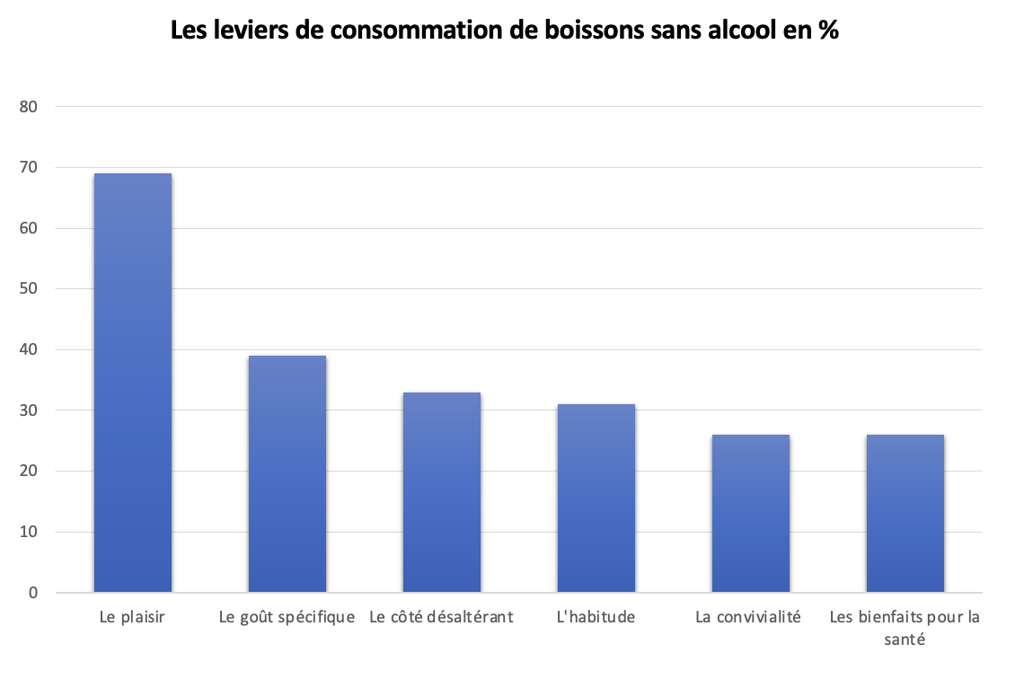 L’envie de varier les goûts pour rompre la monotonie est soulignée par un quart (24%). La dimension sociale est également forte : le quart des Français (26%) consomment des boissons autres que de l’eau plate et sans alcool lors d’un moment de partage avec leur entourage. Dans ce cadre, la boisson devient un marqueur de ce temps privilégié et de convivialité. Ainsi, la satisfaction des sens et le plaisir social pre?dominent largement la question relative à la motivation de l’acte d’achat.