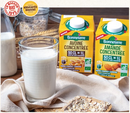 La quantité d’eau dans les boissons végétales concentrées Bonneterre a réduit de 50 %. Pour obtenir exactement le même goût que dans les formats 1L, c’est facile : on mélange en quantités égales eau et boisson végétale concentrée.