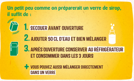 On peut soit préparer son mélange à l’avance et garder ensuite au frigo pendant 3 jours, ou mélanger directement dans son verre juste avant de boire. Chacun peut ajouter plus ou moins d’eau selon ses préférences et usages.