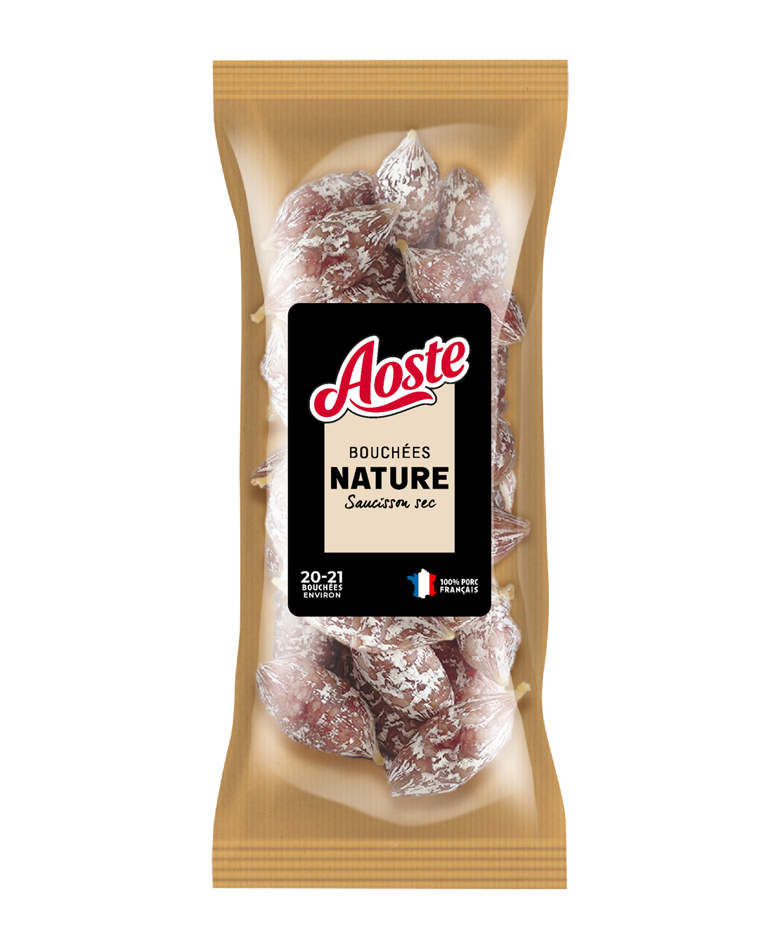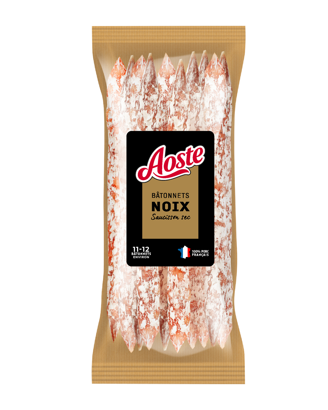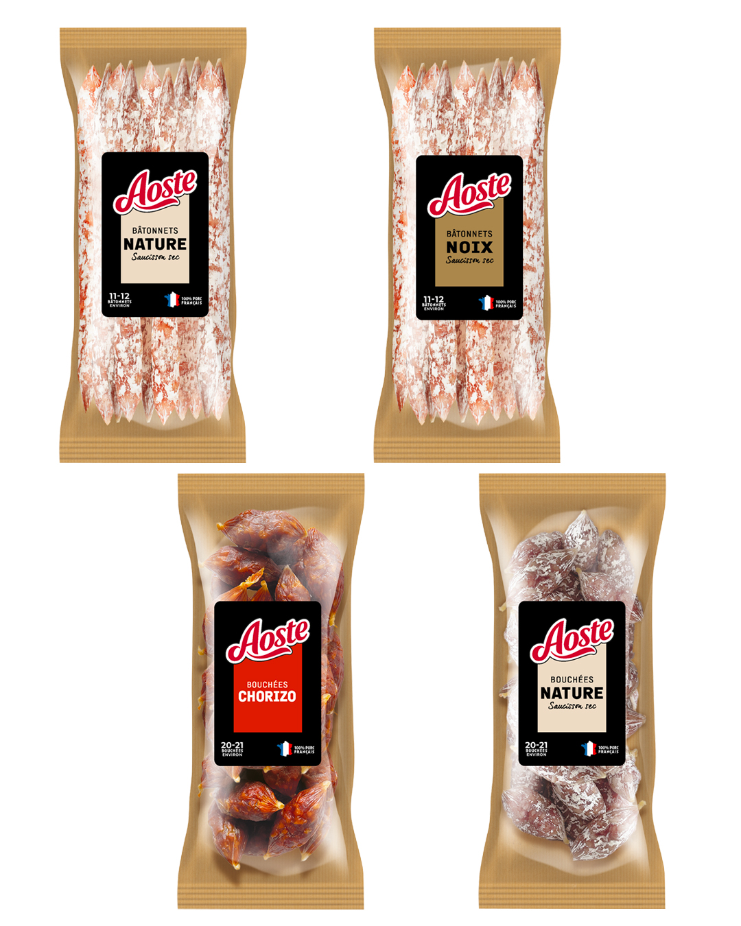 Côté recette, Aoste met en avant des saucissons secs supérieurs, fabriqués en France à partir de viande 100 % française certifiée VPF (Le Porc Français).