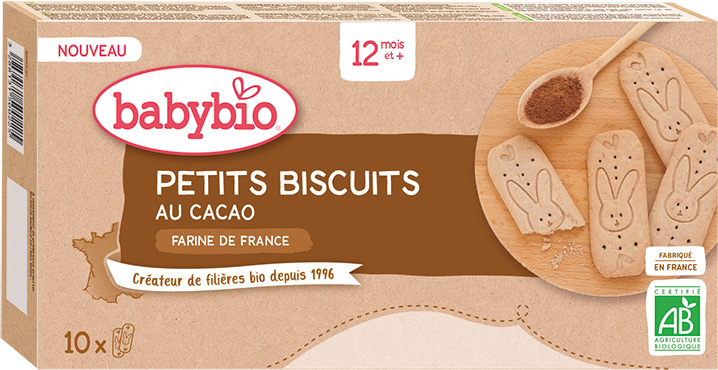 Ces deux nouvelles recettes révèlent des biscuits à la fois fondants et croustillants aux délicieuses notes de Cacao en poudre sans arôme ajouté pour la première, ou au bon goût de Vanille Bourbon de Madagascar pour la deuxième, pour un quatre-heures tout en douceur. Confectionnés en France avec de la farine bio française, ces biscuits ont été imaginés dans une forme et une texture idéales pour favoriser l’éveil des bébés dès 12 mois.