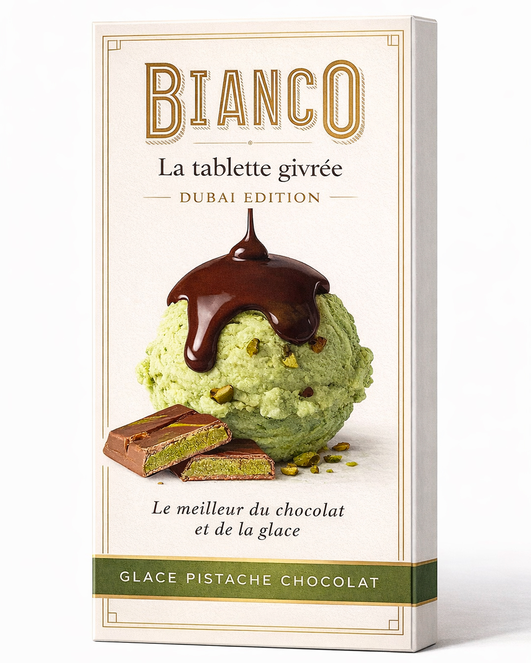 Bianco transpose sa recette emblématique pistache-chocolat dans un format tablette glacée reprenant les codes de sa très populaire Dubai Edition.