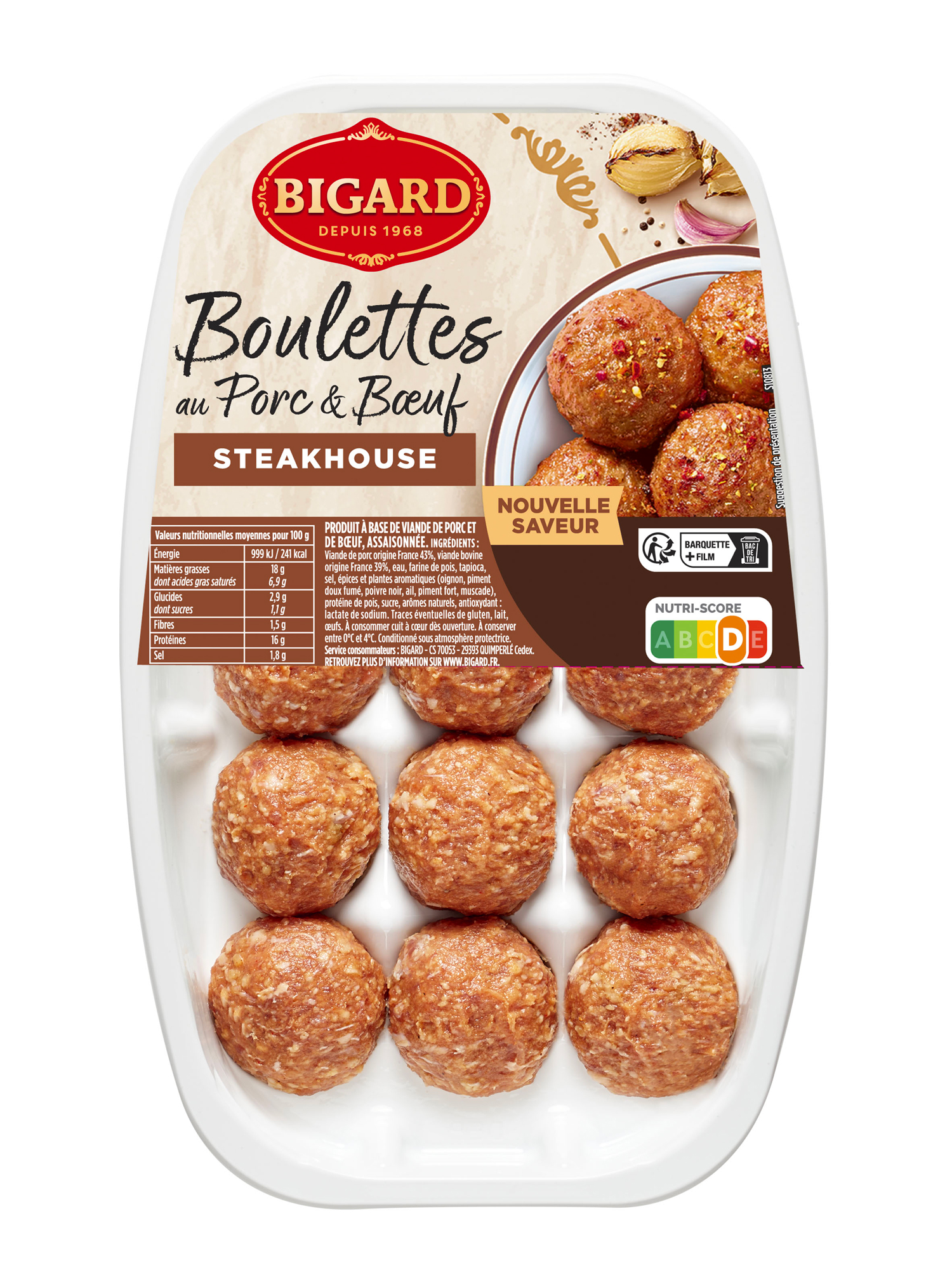 Préparées à partir de viande de porc et de bœuf origine France, les boulettes steakhouse affichent un mélange d’oignons, tomates et piment doux qui évoque les grillades américaines.