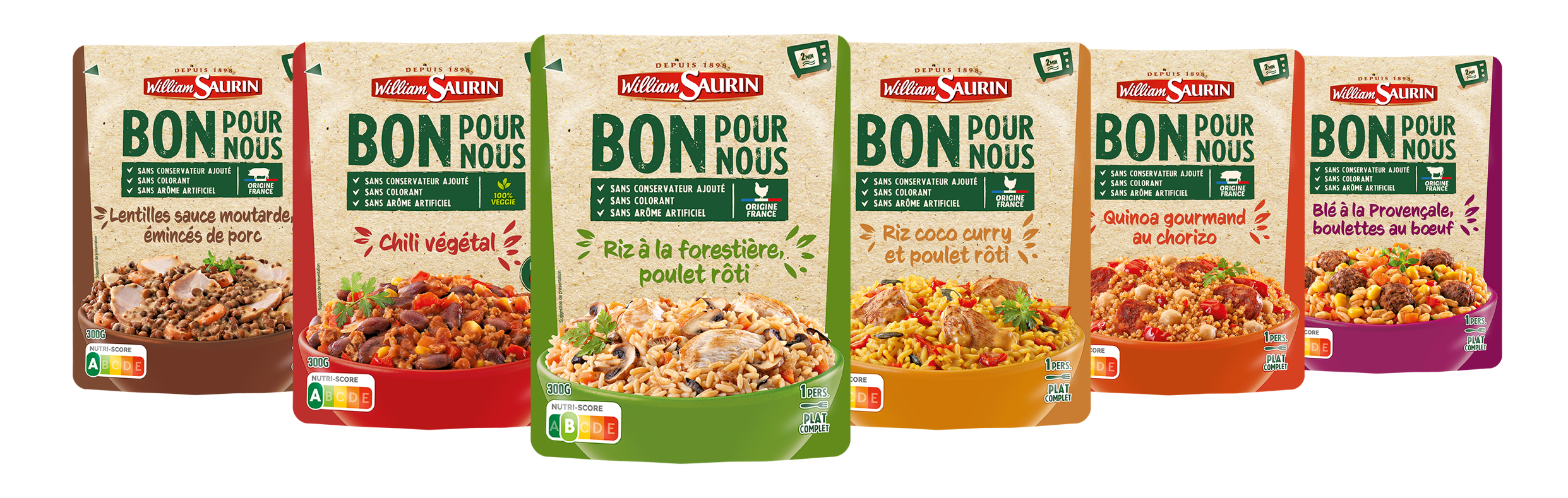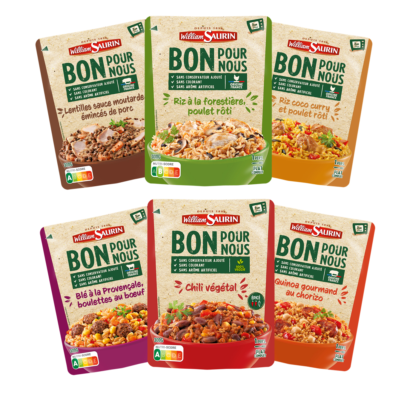Bon Pour Nous, une nouvelle gamme de la marque William Saurin se compose de six nouvelles recettes élaborées à partir de viande française, sans conservateur ajouté, colorant ni arômes artificiels et affichant un Nutriscore A ou B. Proposées dans un sachet souple dit « doypack », moderne et léger, elles se prêtent à une consommation rapide et pratique pour disposer facilement d’un plat complet, et à un prix accessible.