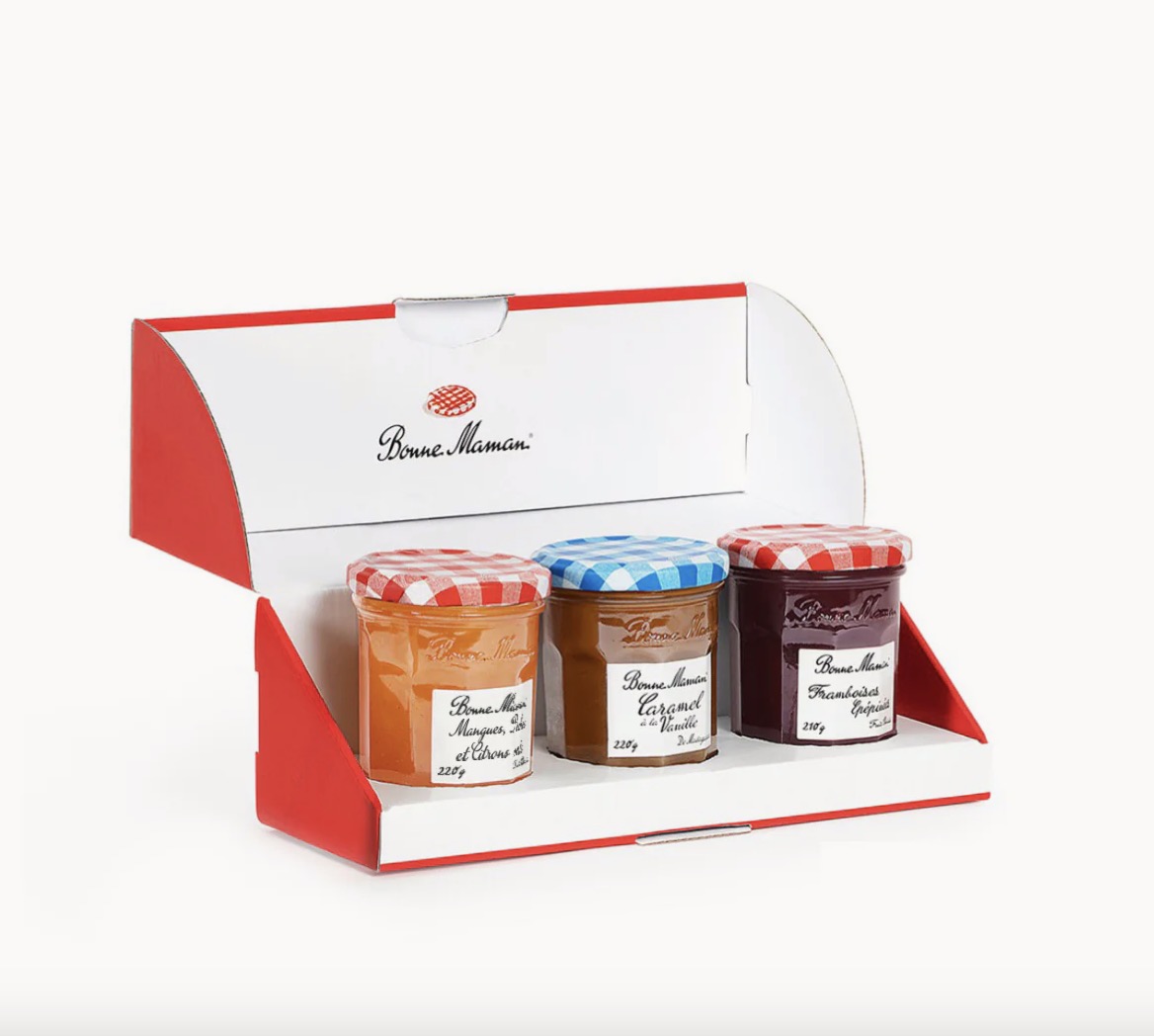 Ce trio gourmand réunit une confiture de framboises épépinées, un caramel délicatement parfumé à la vanille de Madagascar et une préparation fruitée à base de mangues, pêches et citrons verts. De quoi enchanter les crêpes et séduire tous les palais.
