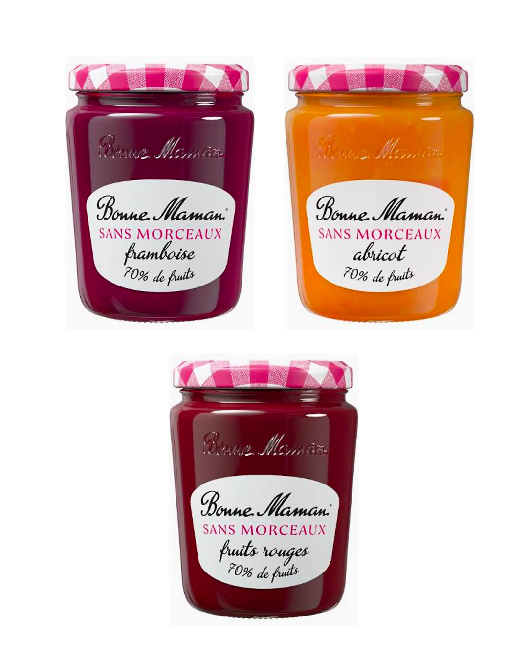 Bonne Maman décline ses recettes iconiques en version sans morceaux avec trois parfums : abricot, fruits rouges et framboise.