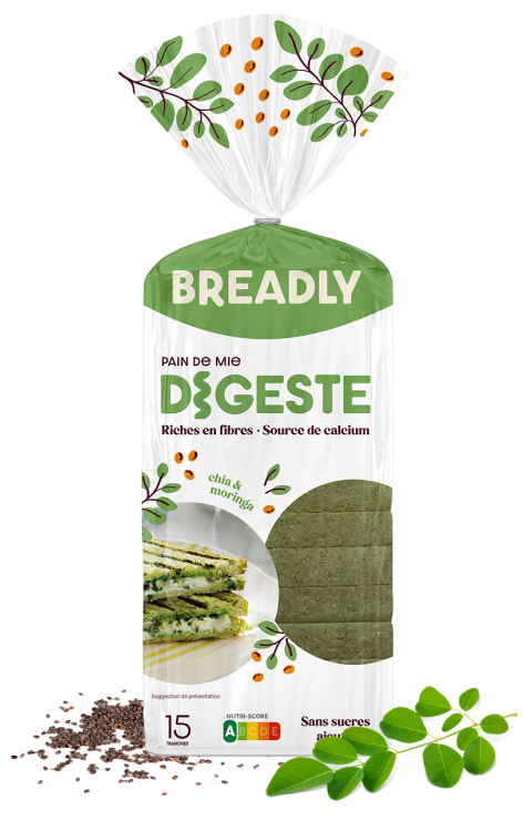 DIGESTE : pain de mie de couleur verte. Apporte fibres, calcium et confort digestif