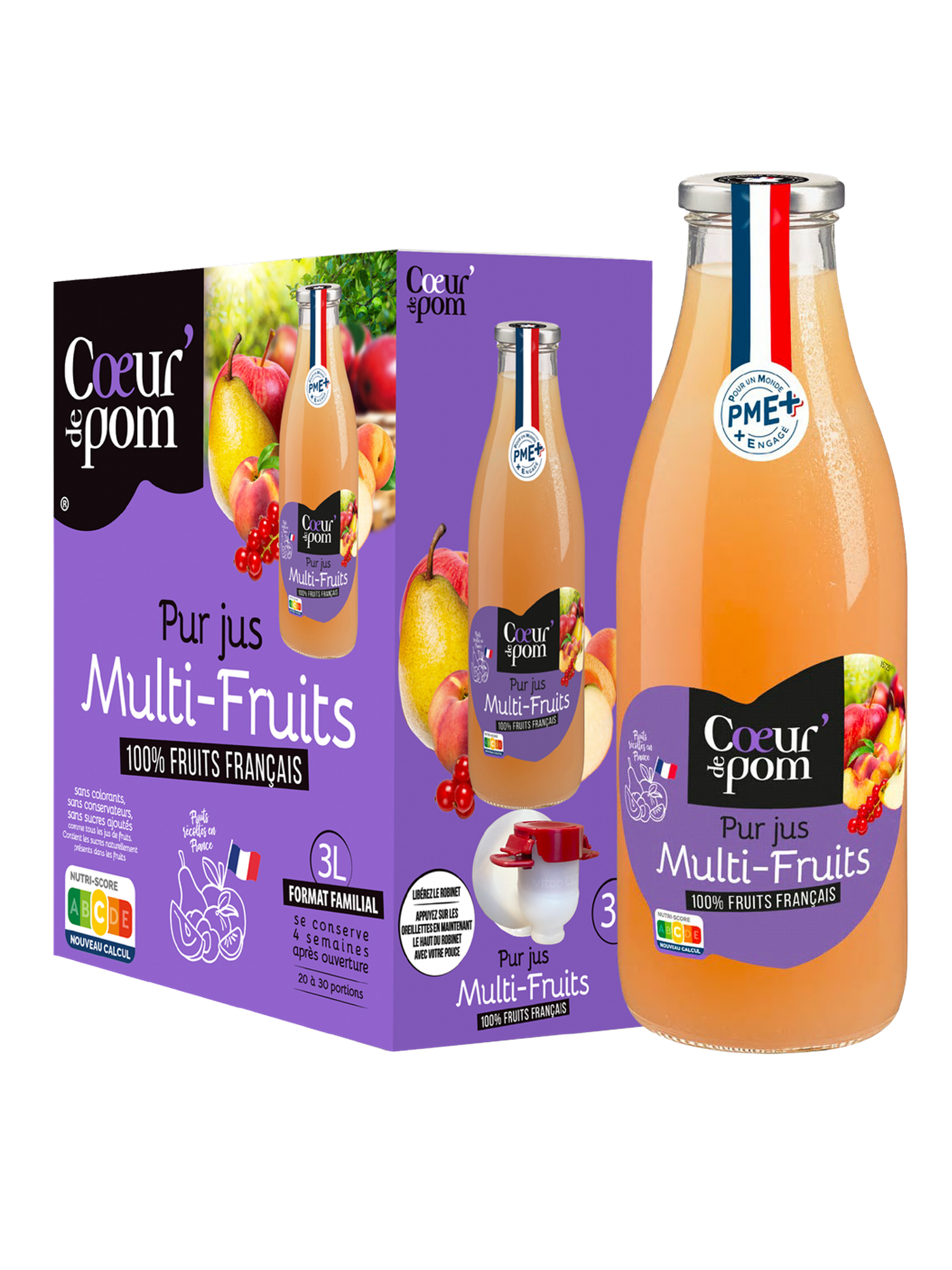 Cœur de Pom’ enrichit son rayon avec un pur jus multi-fruits conçu uniquement à partir de fruits cultivés en France.
