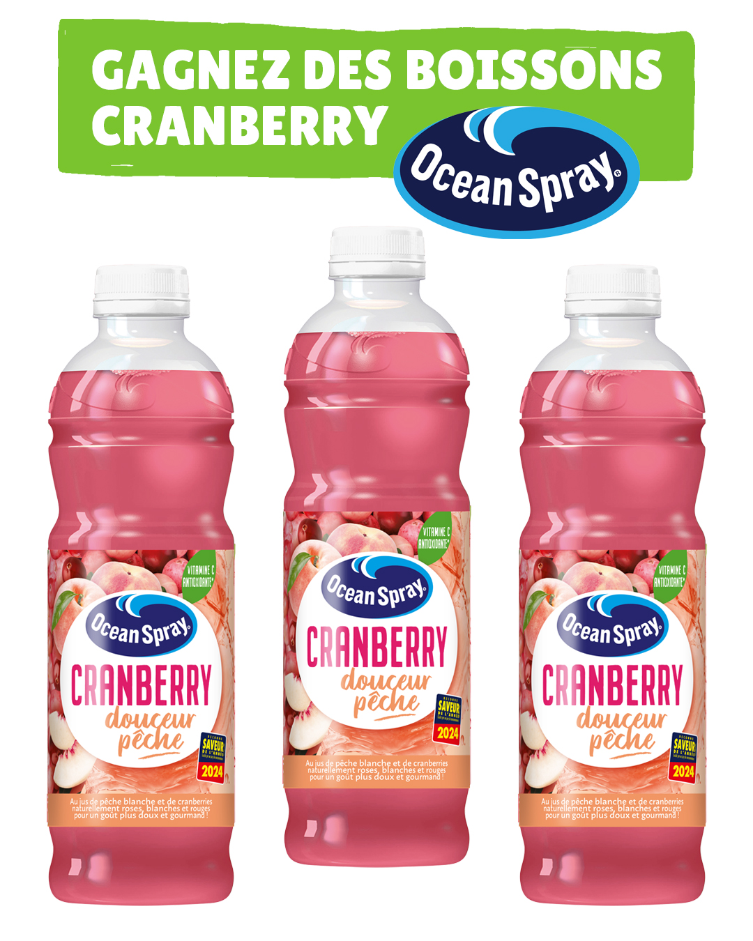 Ocean Spray vous invite à goûter à sa Douceur Pêche, une alliance unique de cranberries rouges, roses et blanches pour une boisson plus douce, fruitée et ultra rafraîchissante.