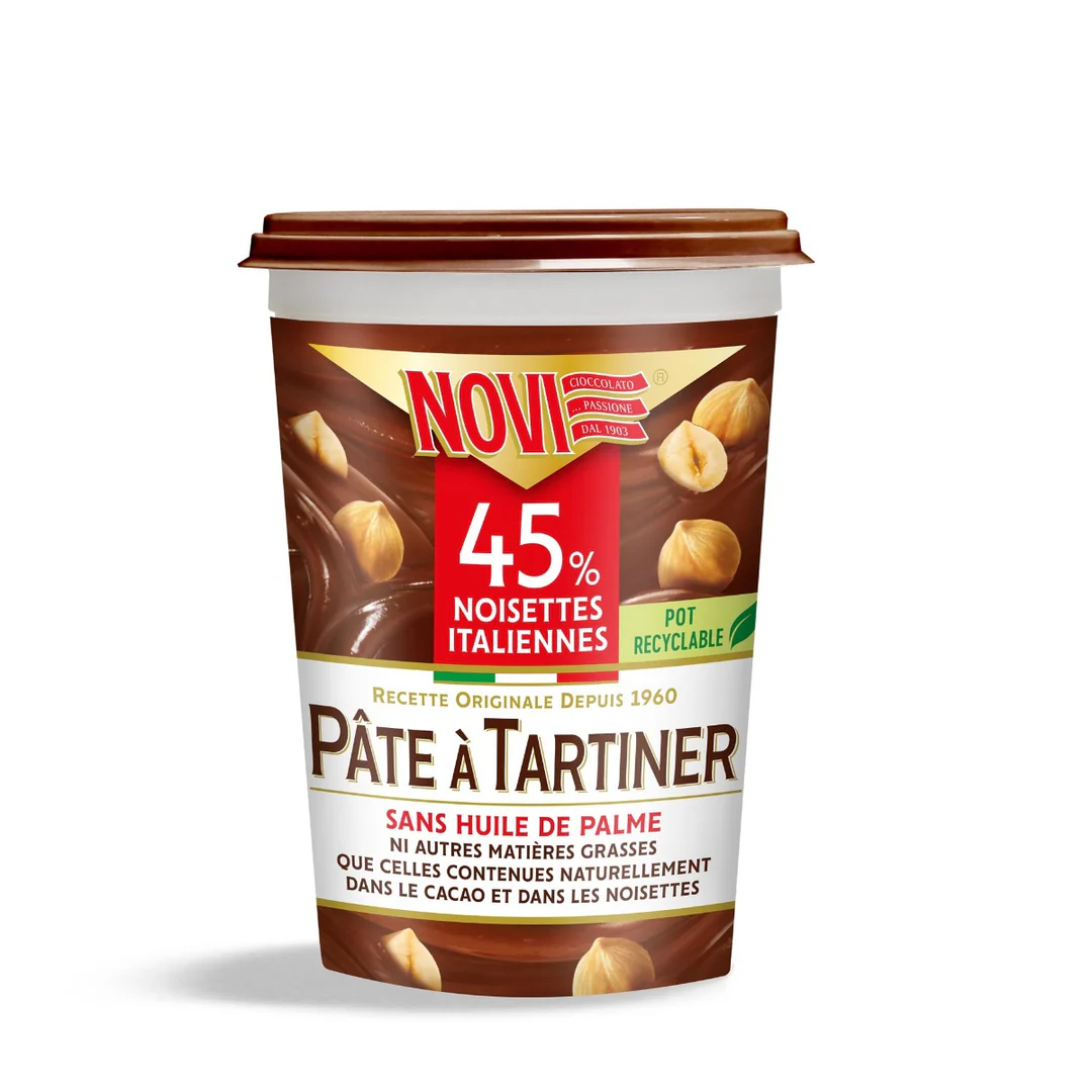 Crema Novi, une authentique spécialité italienne, se distingue par son fort pourcentage de noisettes (45%). Cette pâte à tartiner, sans huile de palme ni matières grasses ajoutées, puise sa richesse dans les noisettes italiennes et le cacao, garantissant une texture unique et un goût intense.