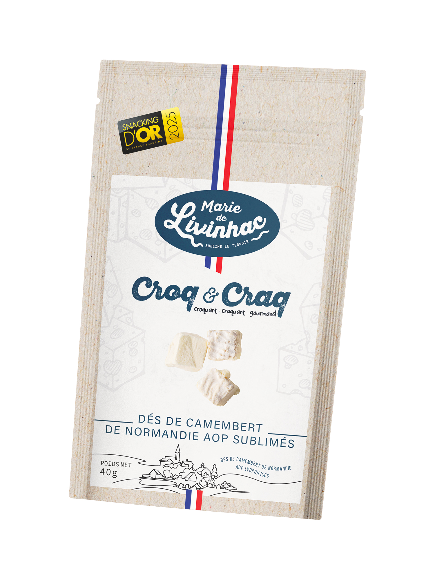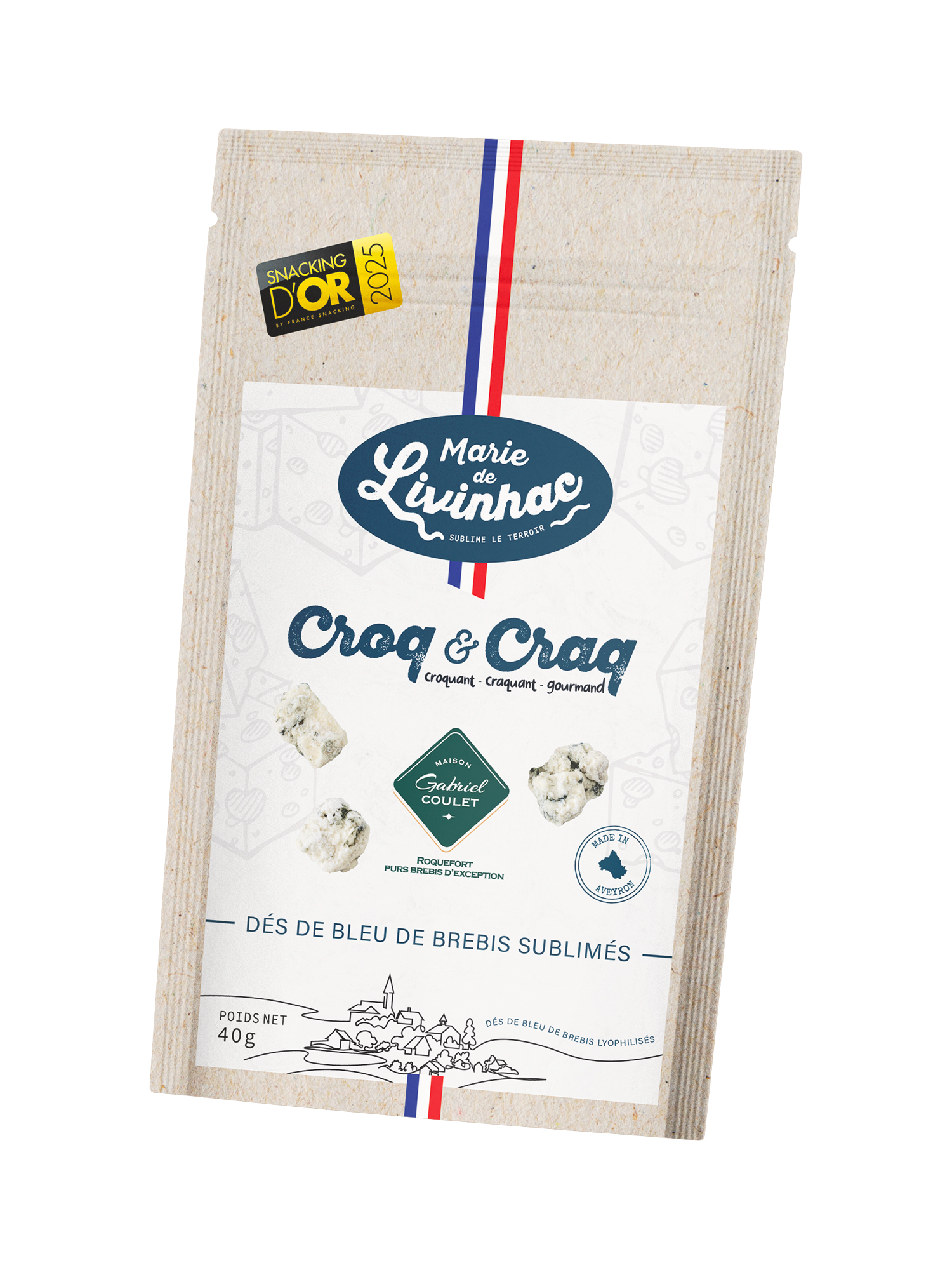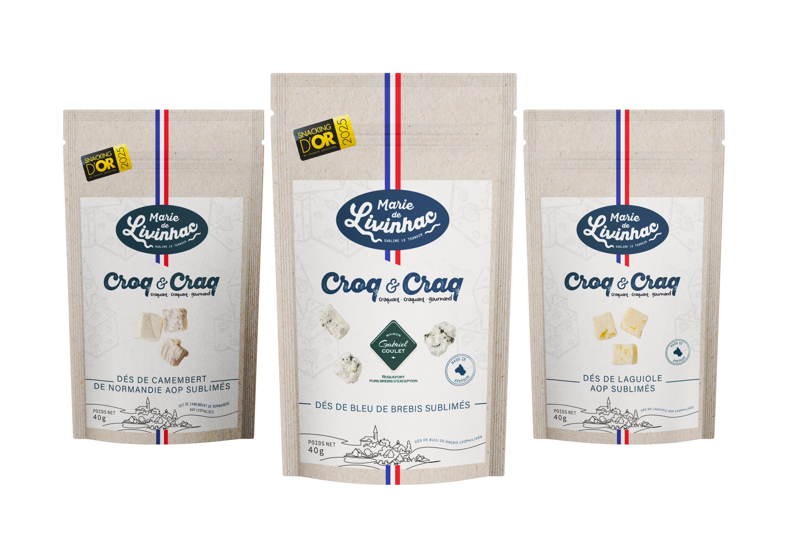 Roquefort, Camembert et Laguiole se retrouvent sous une forme croustillante, légère et étonnamment fondante, grâce à un procédé de lyophilisation naturelle.