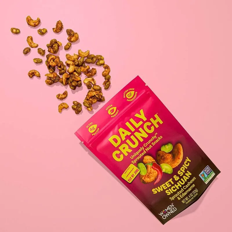 Daily Crunch s’associe à Fly By Jing, célèbre pour son Sichuan Chili Crisp, pour proposer une nouvelle collation sucrée-épicée. Ce mélange associe des noix de cajou germées et des fèves d’edamame, avec une touche savamment dosée de piment sichuanais. 100 % végétal, sans gluten, et riche en protéines, ce snack coche toutes les cases des tendances alimentaires actuelles.