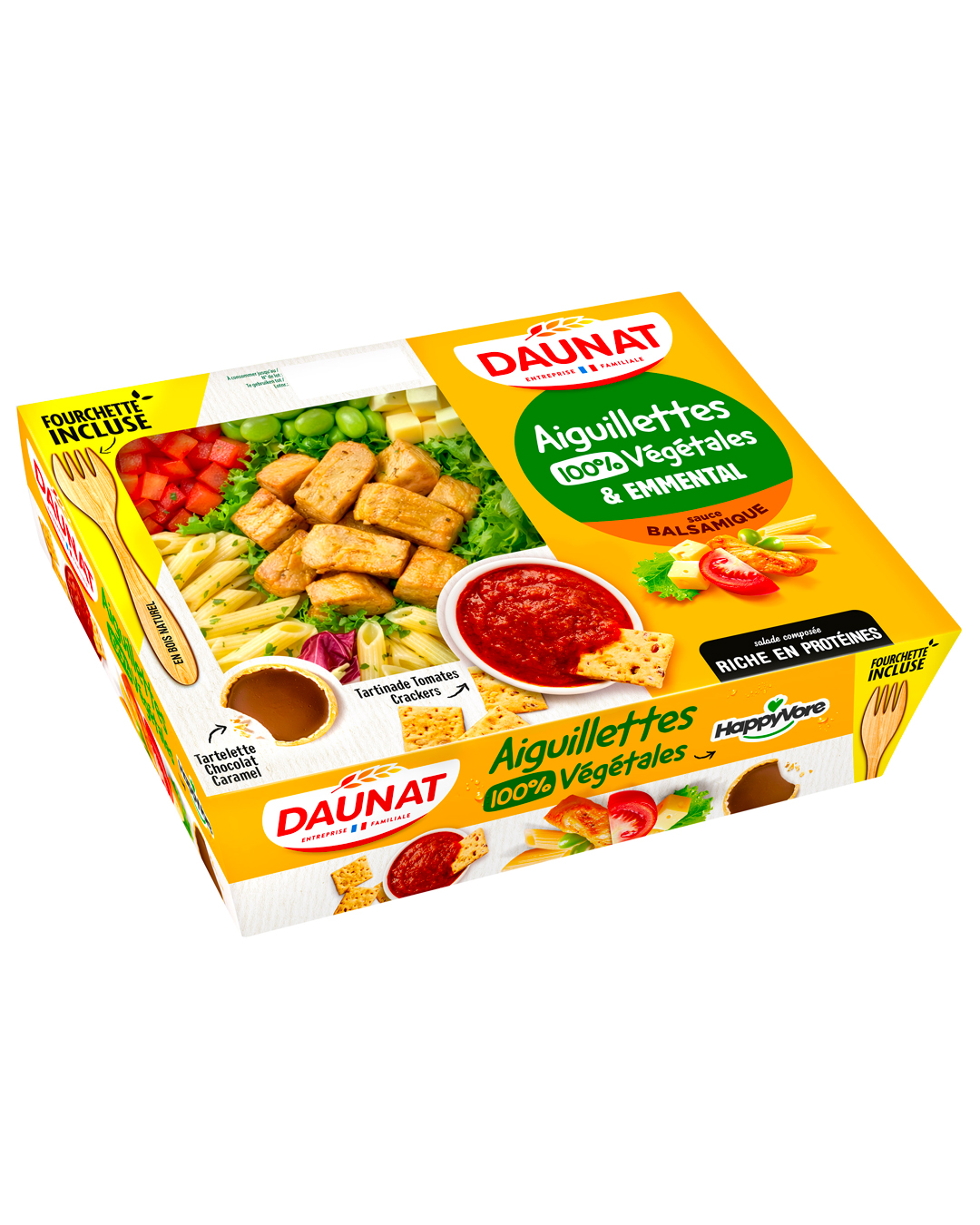 La recette s’articule autour d’aiguillettes 100 % végétales, accompagnées d’emmental et d’une sauce balsamique, avec une composition pensée pour allier praticité et gourmandise.