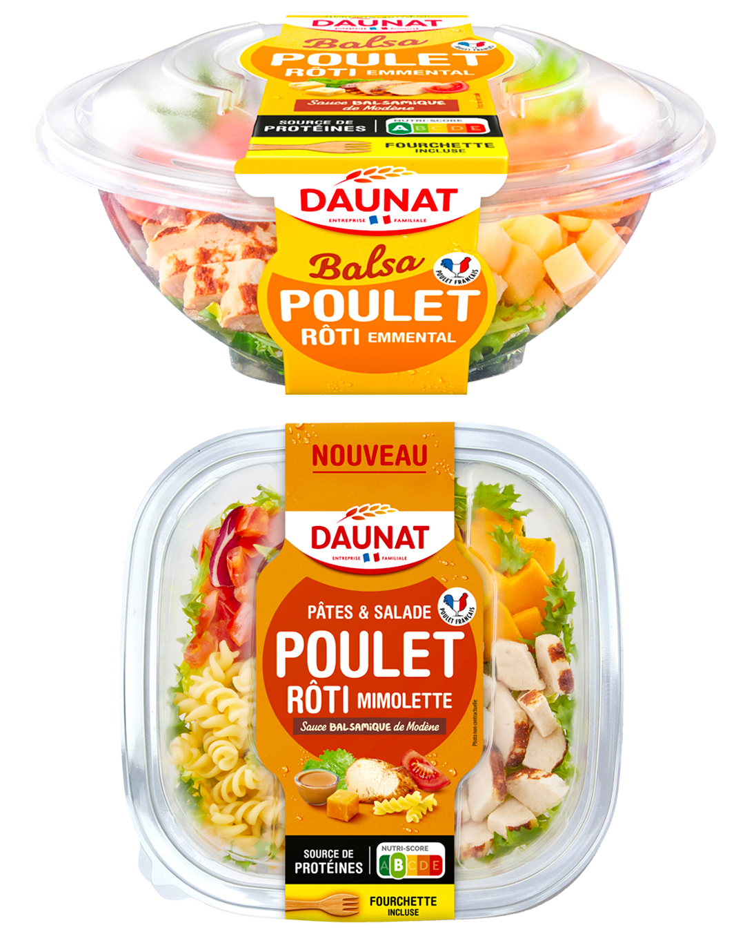 Dans le même élan, Daunat étoffe aussi sa gamme Salade Gourmande avec une version Poulet rôti mimolette, où les pâtes se mêlent aux crudités et à une sauce balsamique onctueuse.