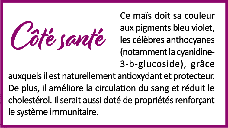 Le Maïs Mauve GUAYAPI est une variété de Maïs ancestrale, cultivée en plein cœur de l’ancien empire des Incas. Ce Maïs autochtone tient sa couleur étonnante aux anthocyanes, des pigments violets aux nombreuses vertus.