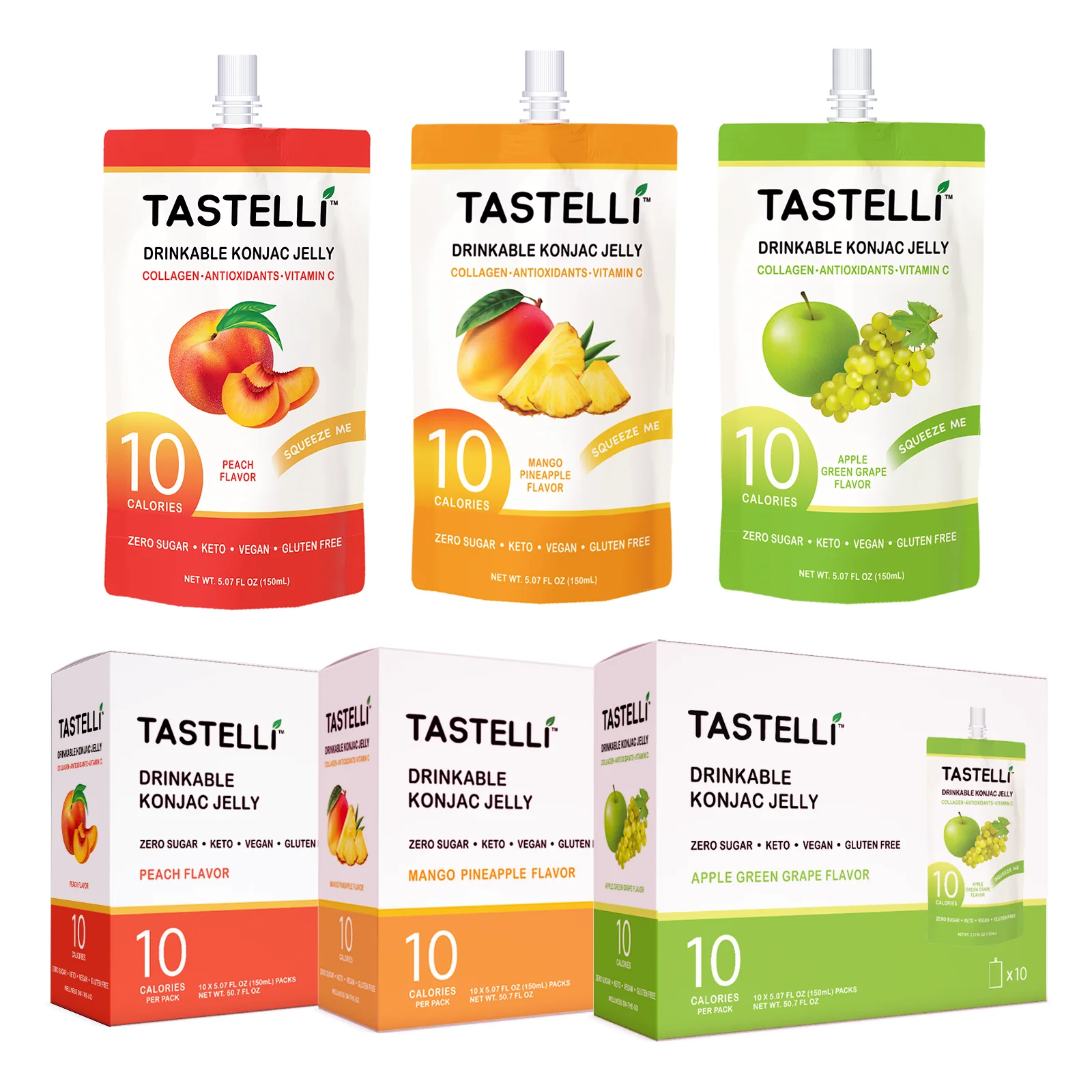 La gelée de konjac à boire de Tastelli est un produit à base de plantes, pauvre en calories, sans sucre et riche en collagène, antioxydants et vitamines. Contrairement aux autres types de gelées emballées dans des coupelles, celles-ci conviennent particulièrement à la consommation en déplacement grâce à leur emballage en poche compressible et à leurs embouts prêts à boire.