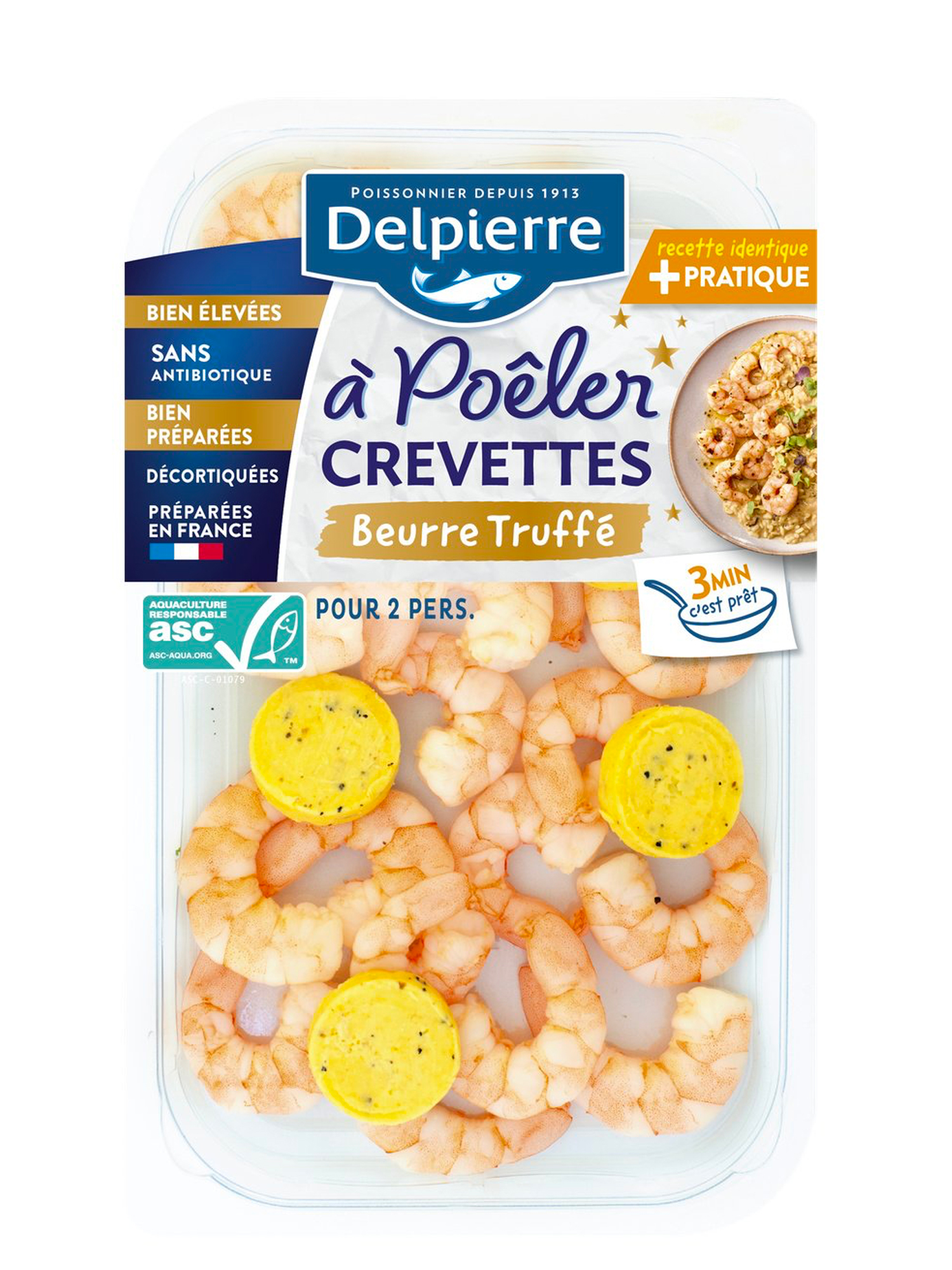 Delpierre glisse une touche chic dans les repas du quotidien avec un duo qui sent bon les fêtes : des crevettes décortiquées prêtes à poêler, accompagnées de palets de beurre truffé.