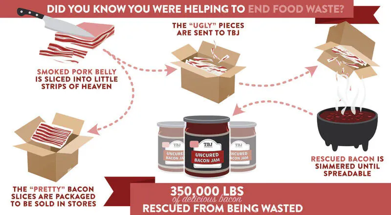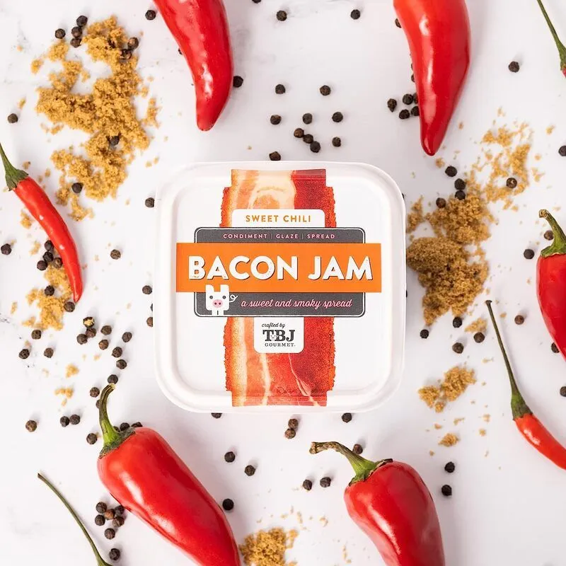 TBJ Gourmet fabrique des confitures de bacon recyclé aux saveurs sucrées, mais aussi salées, fumées ou épicées. Bien que les confitures soient généralement associées aux fruits, ces confitures offrent aux amateurs de bacon une manière différente de savourer leurs repas du matin, leurs sandwichs de petit-déjeuner, leurs collations, et bien plus encore.