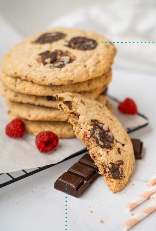 Toujours préparés avec des ingrédients de grande qualité (beurre frais AOP Charentes-Poitou, œufs bio, etc.) et toujours exempte d’arômes artificiels, d’agents de texture ou d’huile de palme, le duo d’ingrédients stars de ce cookie s’annonce comme la première note de soleil du printemps. Et framboise sur le cookie… Le cacao des pépites de chocolat est cultivé de manière durable en Afrique de l’Ouest !
