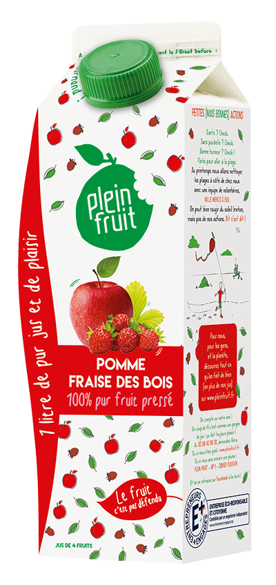 C’est l’histoire d’une pomme qui se rend un jour à un gala de fin d’été. Elle danse, tourne, vire sur la piste et s’éprend d’une fraise des bois qui illumine la soirée. Les jambes en compote, la pomme s’avance puis s’agenouille pour lui demander sa main. Depuis ce jour les fraises de Plein fruit sont cuiellies à la main, pour faire de ce jus de pomme – fraise des bois, une délicieuse histoire d’amour.