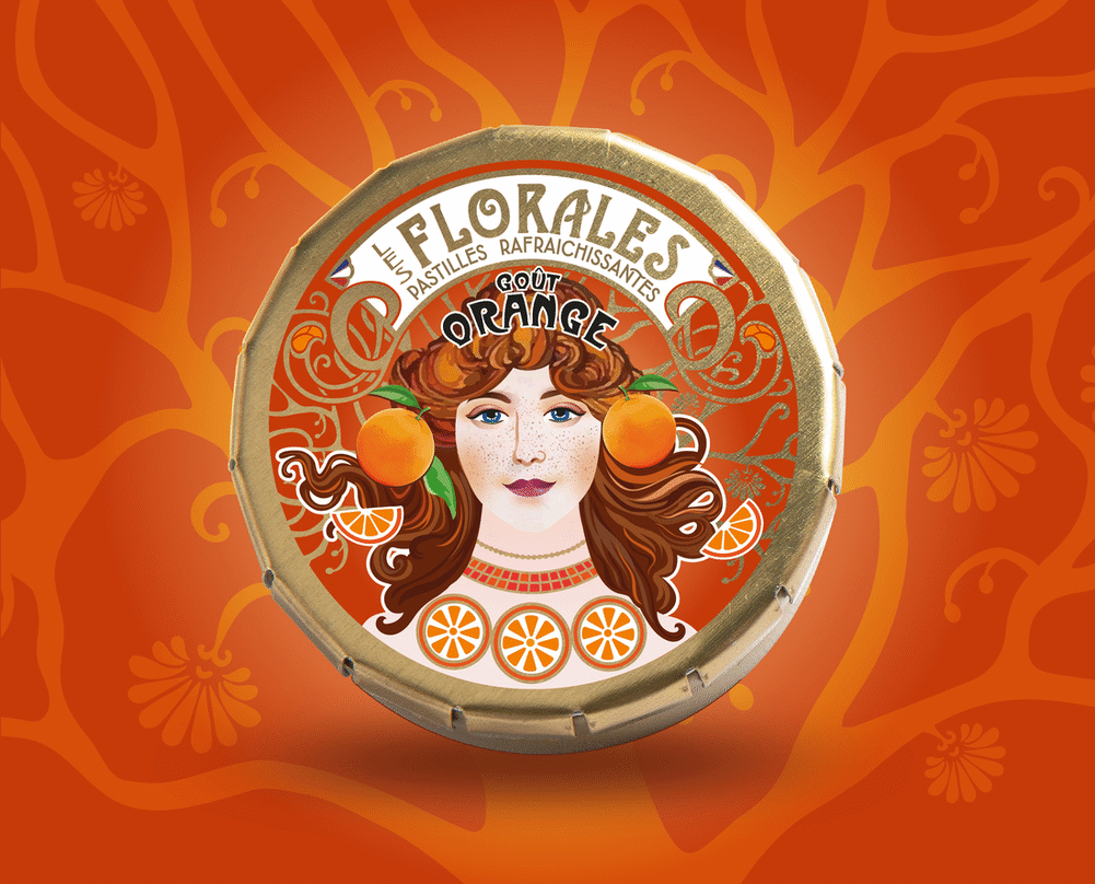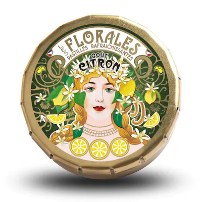 D’inspiration Art Nouveau, la gamme Les Florales de bonbons pastilles privilégie les arabesques et renoue avec un retour à la nature, la flore et à la simplicité. L’émergence de ce style décoratif remet au goût du jour les vertus de l’artisanat face à la production industrielle.