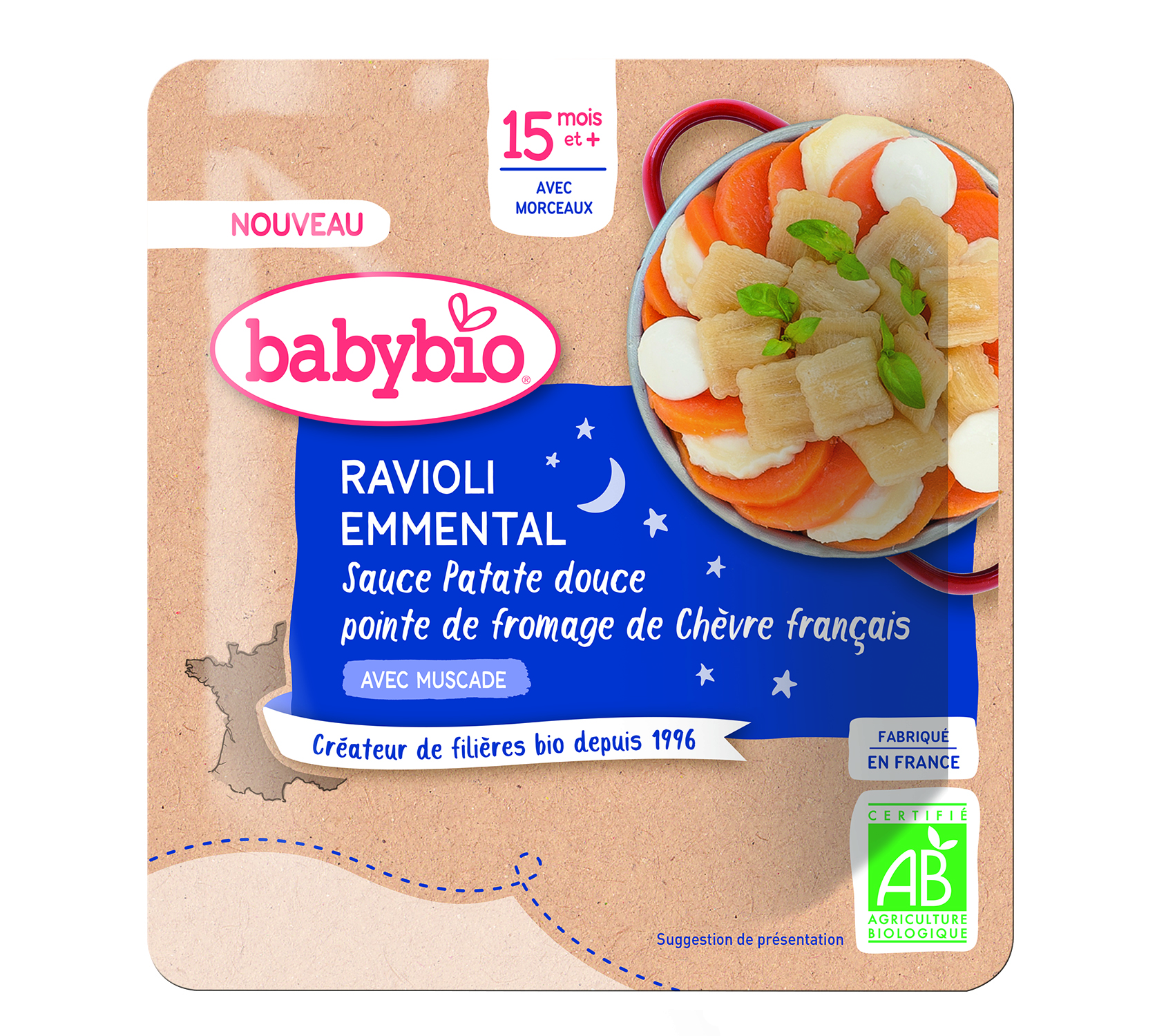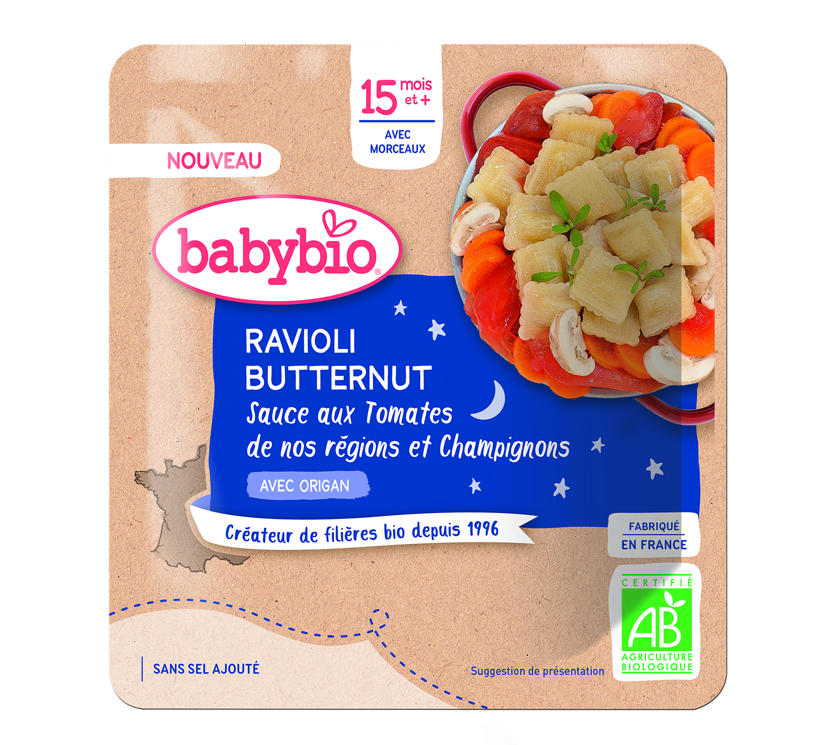 Deux recettes ultra-gourmandes de raviolis bio entiers, cuisinés en France avec une majorité d’ingrédients provenant de nos régions pour transmettre le vrai goût de notre terroir et initier les petit-bouts à de nouvelles saveurs.