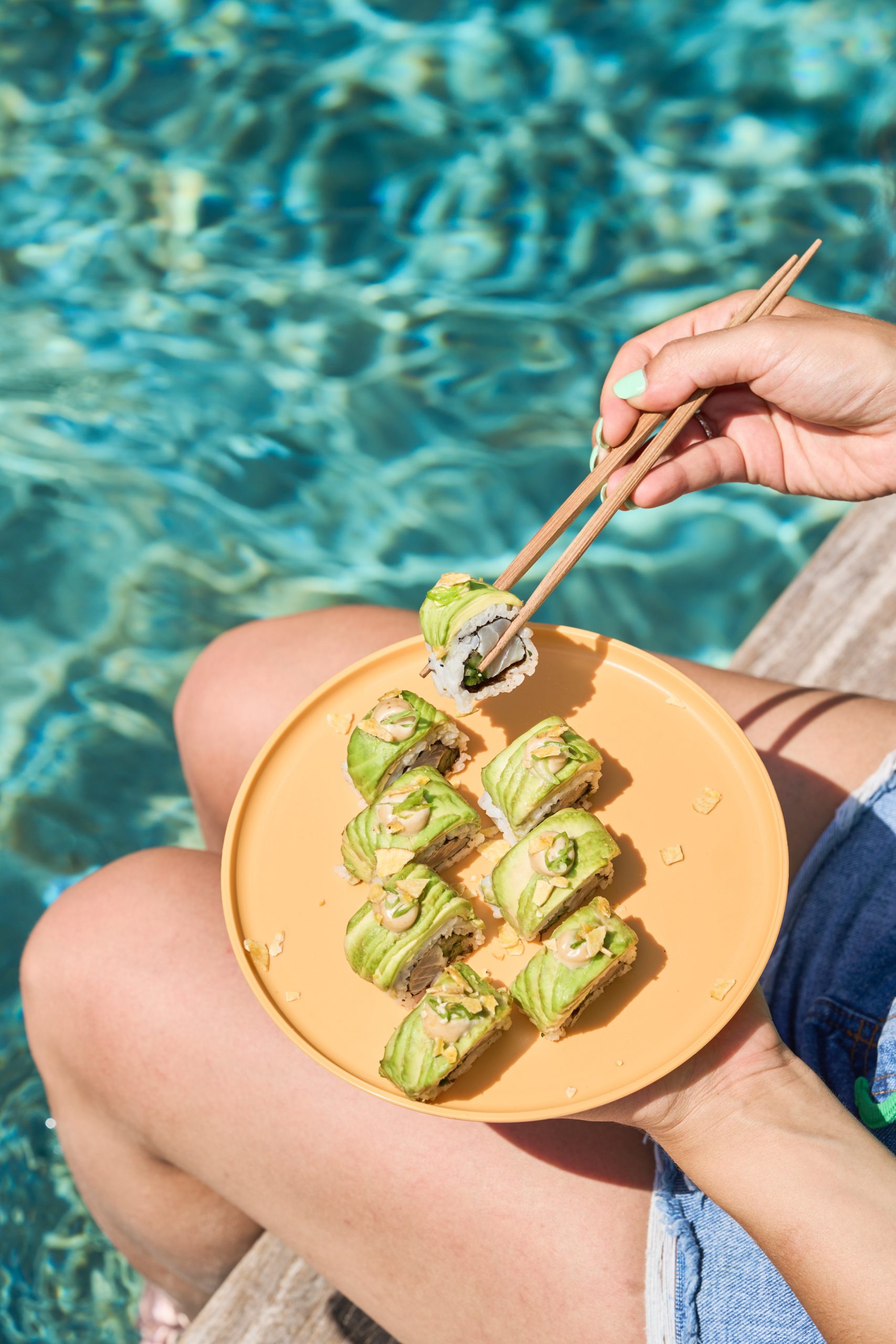 Associant la fraîcheur du mahi-mahi mariné avec menthe et citron vert au croquant du concombre, ce roll s’inspire du cocktail brésilien du même nom. Surmonté de fines lamelles d’avocat et décoré d’une chips de banane plantain, il est relevé par une pointe de mayon- naise au gingembre et nous transporte sur les plages de Fortaleza.