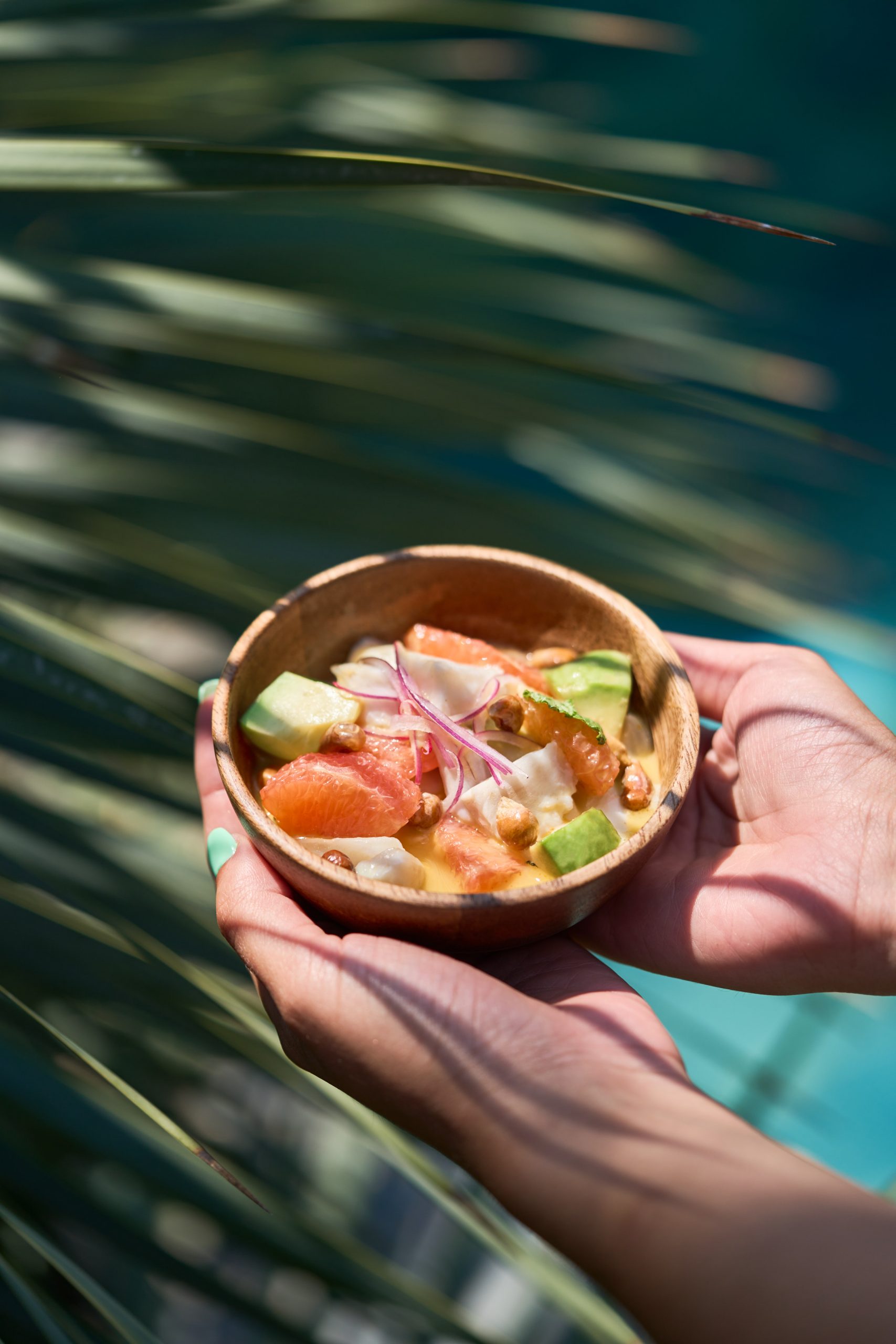 Ce petit ceviche de mahi-mahi mariné avec du citron vert et de la menthe est accompagné de pamplemousse, avocat et maïs cancha grillé et assaisonné d’une sauce au maracuja.
