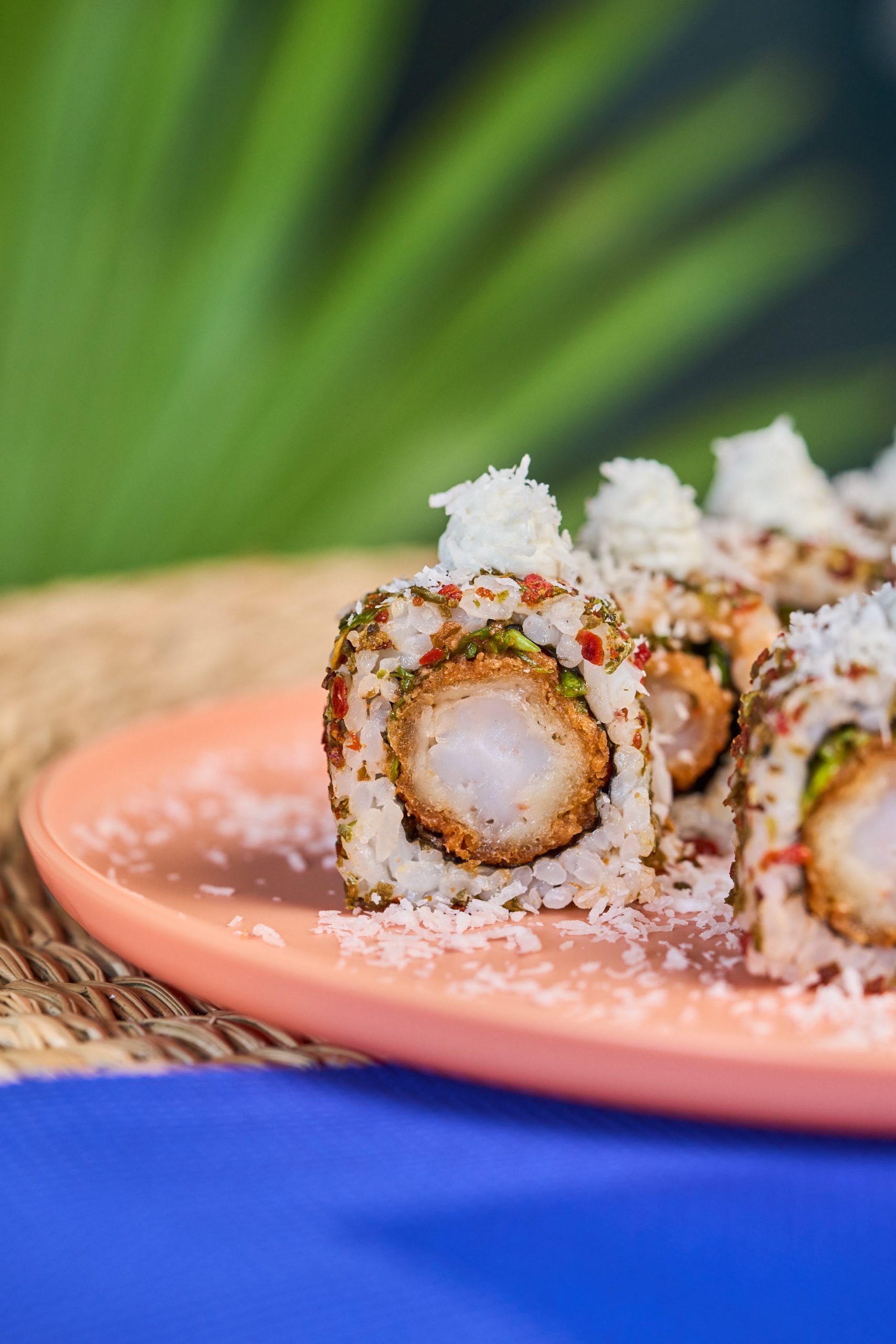 Inspiré du traditionnel plat brésilien, ce roll est entouré de poivron déshydraté et surmonté de fromage frais et de noix de coco râpée. Il renferme une croustillante crevette panée au pankoac- compagnée d’oignon nouveau et relevée par une sauce tomate à l’ail.