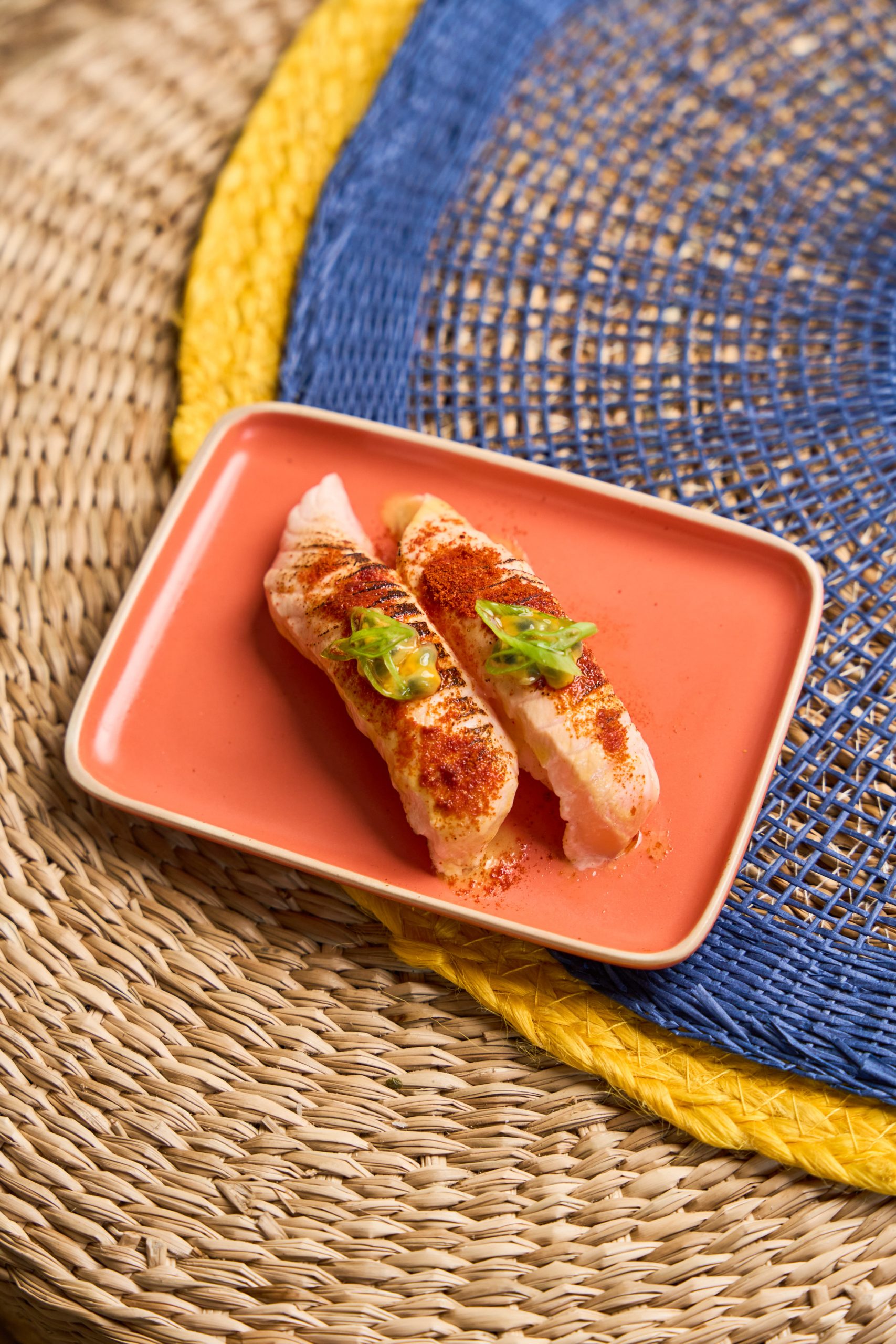 Ce sushi saumon flambé au chalumeau est saupoudré d’un mélange d’épices couramment utilisé pour assaisonner les plats brésiliens : le tempero baïano. Sur le dessus, du fruit de la passion frais et de