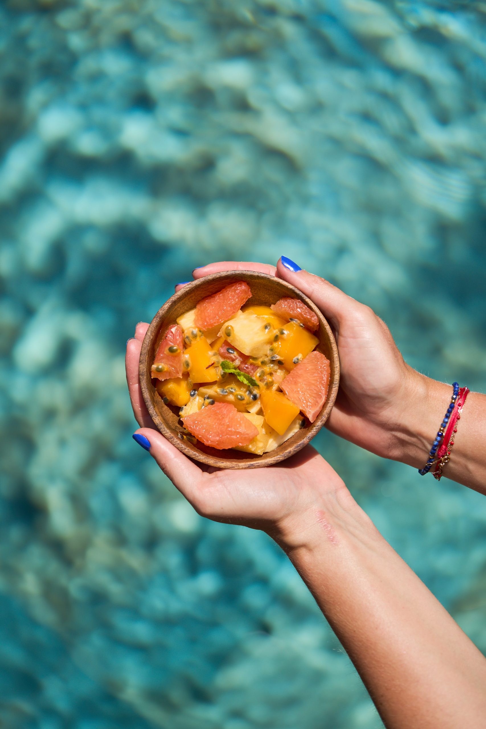 Alliant la mangue, l’ananas, le fruit de la passion et le pamplemousse frais, cette salade de fruits est relevée d’un trait de citron vert et de menthe fraîche.
