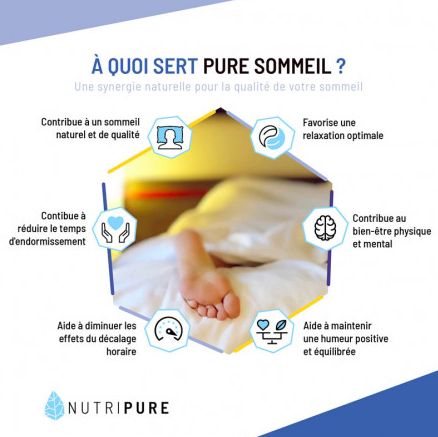 Composé principalement de mélatonine et de plantes, Pure Sommeil de Nutripure contribue à retrouver un sommeil paisible et réparateur. La mélatonine permet de réduire significativement le temps d’endormissement, la valériane aide à une relaxation optimale et la mélisse quant à elle, contribue au bien-être physique et mental, ainsi qu’à une humeur positive et équilibrée.