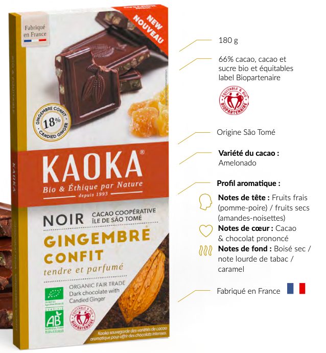 Riche en gingembre confit (18%), elle offre le juste équilibre entre la douceur du chocolat et la puissance épicée du gingembre. Le cacao sélectionné est issu de la filière bio équitable Kaoka à São Tomé, labellisée BIOPARTENAIRE®.