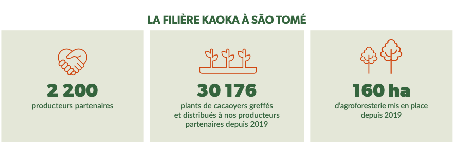 Quand Kaoka arrive à São Tomé, île d’une beauté sauvage, encore préservée du reste du monde, la culture du cacao a été abandonnée depuis de nombreuses années. Tout est à construire. L’objectif ? Relancer la production d’un cacao bio et rémunérateur sur l’île. En 2012, sous le même modèle que la filière créée en Équateur, Kaoka entreprend un travail de rénovation des plantations de cacaoyers improductives.