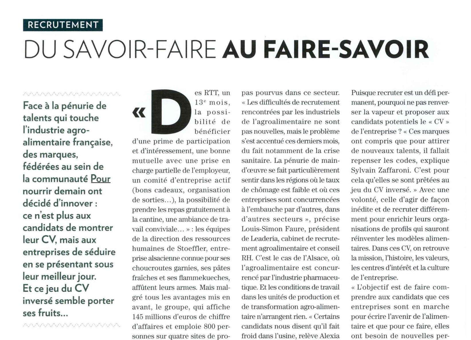 (…) Le CV de Stoeffler met ainsi en avant ses valeurs, sa responsabilité sociale et environnementale (RSE), le « très bien manger », les savoir-faire ancestraux, son engagement vers davantage de naturalité et moins d’additifs… « Aujorud’hui plus que jamais, les candidats attendent des entreprises des actes et des engagements et les entreprises qui ont participté à l’opération CV inverss l’ont bien compris », analyse Sylvain Zaffaroni (…)