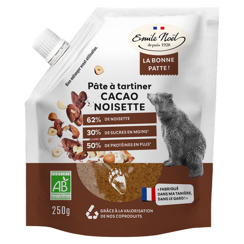 Son format pratique en Doypack rend l’application sur les tartines encore plus facile. Que ce soit pour napper vos tranches de pain ou comme ingrédient secret dans vos muffins, la pâte à tartiner cacao-noisette d’Emile Noël est la « bonne patte » qui sublime chaque moment gourmand.