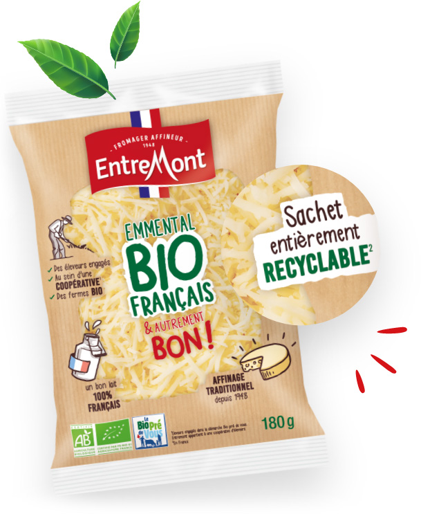 Entremont innove avec un emballage entièrement recyclable pour son Emmental Bio râpé. Après des années de développement en partenariat avec leur fournisseur, ce sachet en polyéthylène assure la même qualité gustative et de conservation.