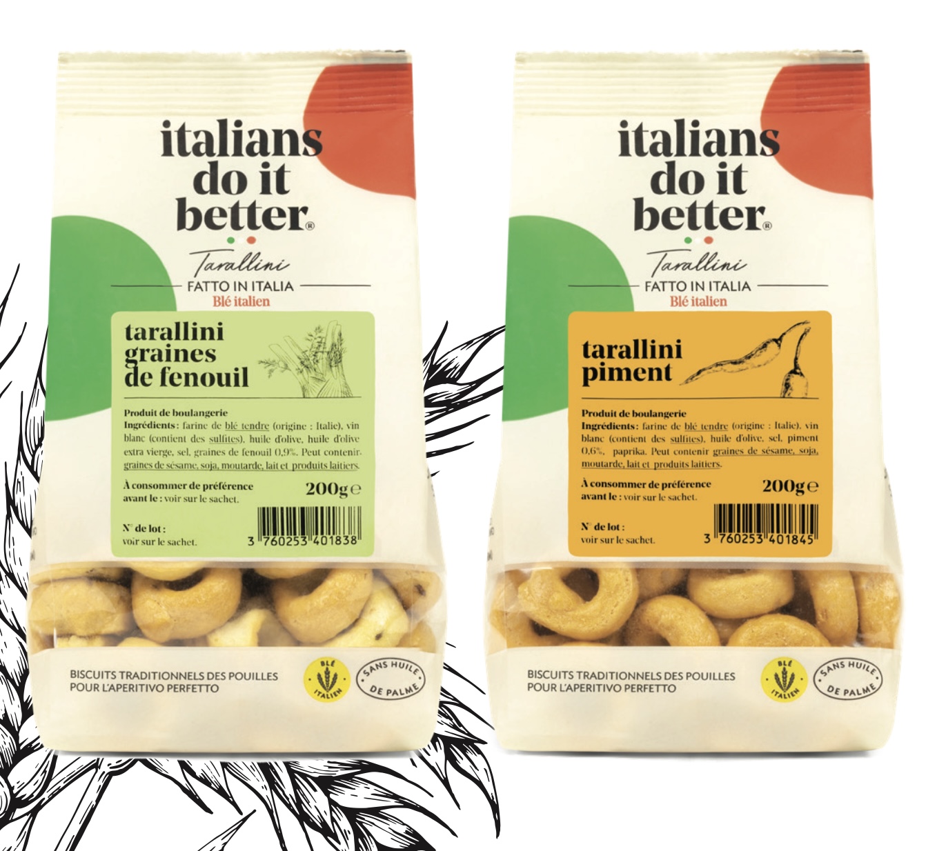 Sans huile de palme, au blé italien et cuits au four dans le respect de la tradition, Italians do it better élargit sa gamme de biscuits salés pour l’apéritif.