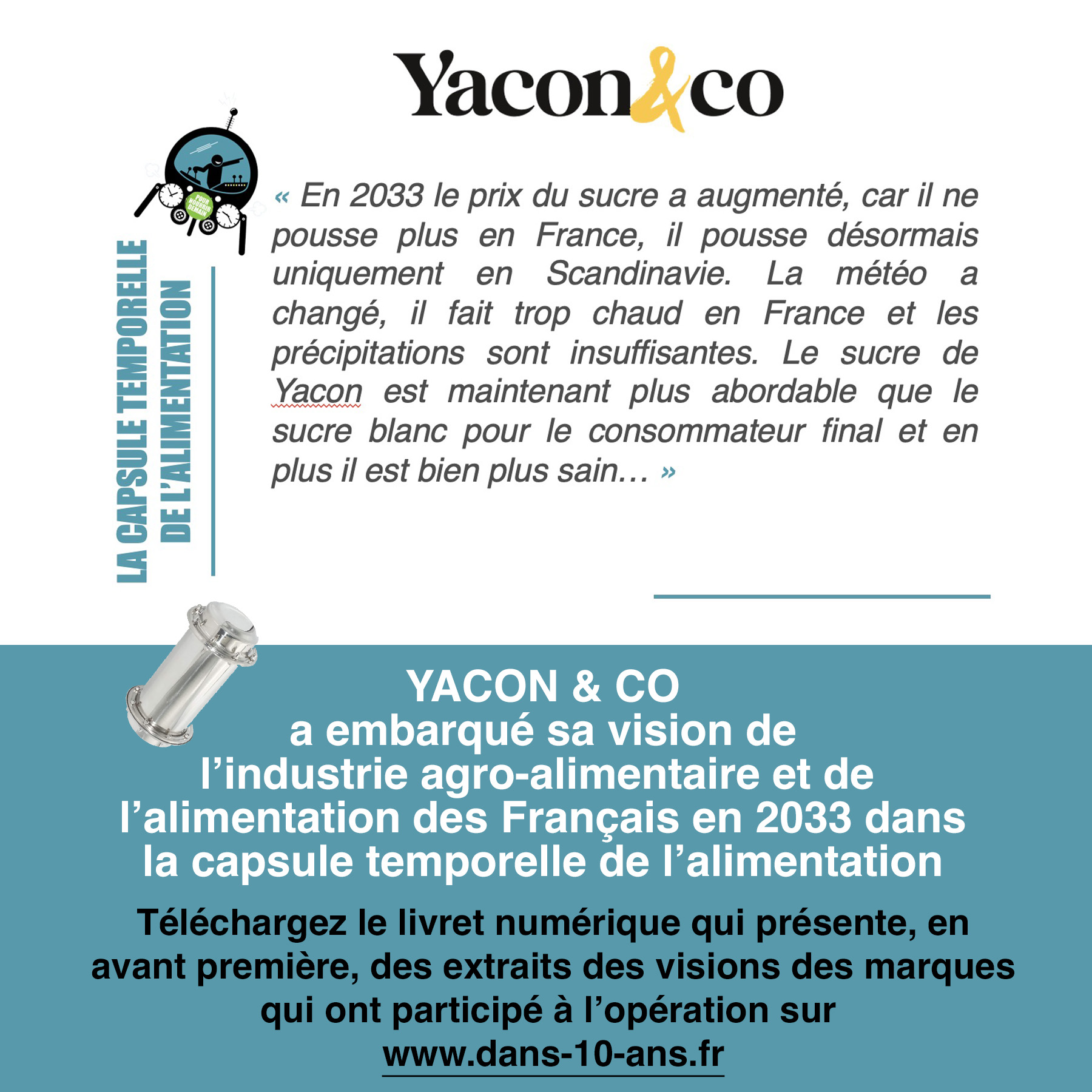 YACON & CO a embarqué sa vision de l’industrie agro-alimentaire et de l’alimentation des Français en 2033 dans la capsule temporelle de l’alimentation.