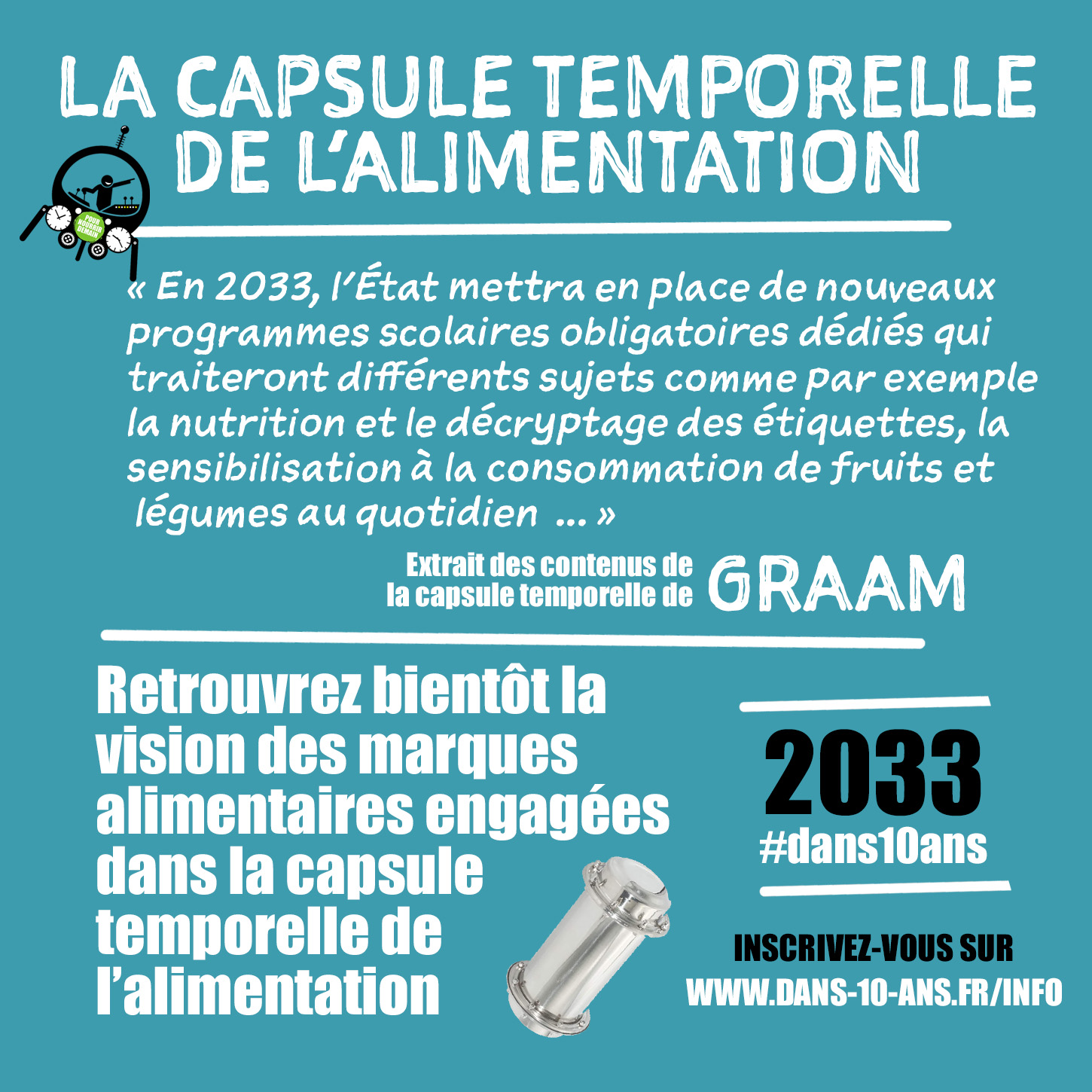 Retrouvez bientôt la vision des marques alimentaires engagées dans la capsule temporelle de l’alimentation en vous inscrivant sur www.dans-10-ans.fr