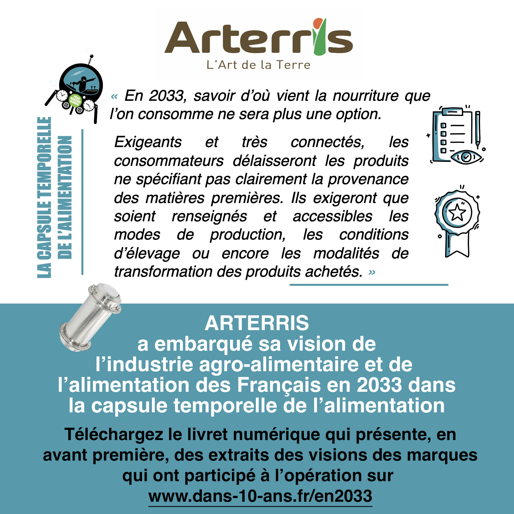 ARTERRIS a embarqué sa vision de l’industrie agro-alimentaire et de l’alimentation des Français en 2033 dans la capsule temporelle de l’alimentation.