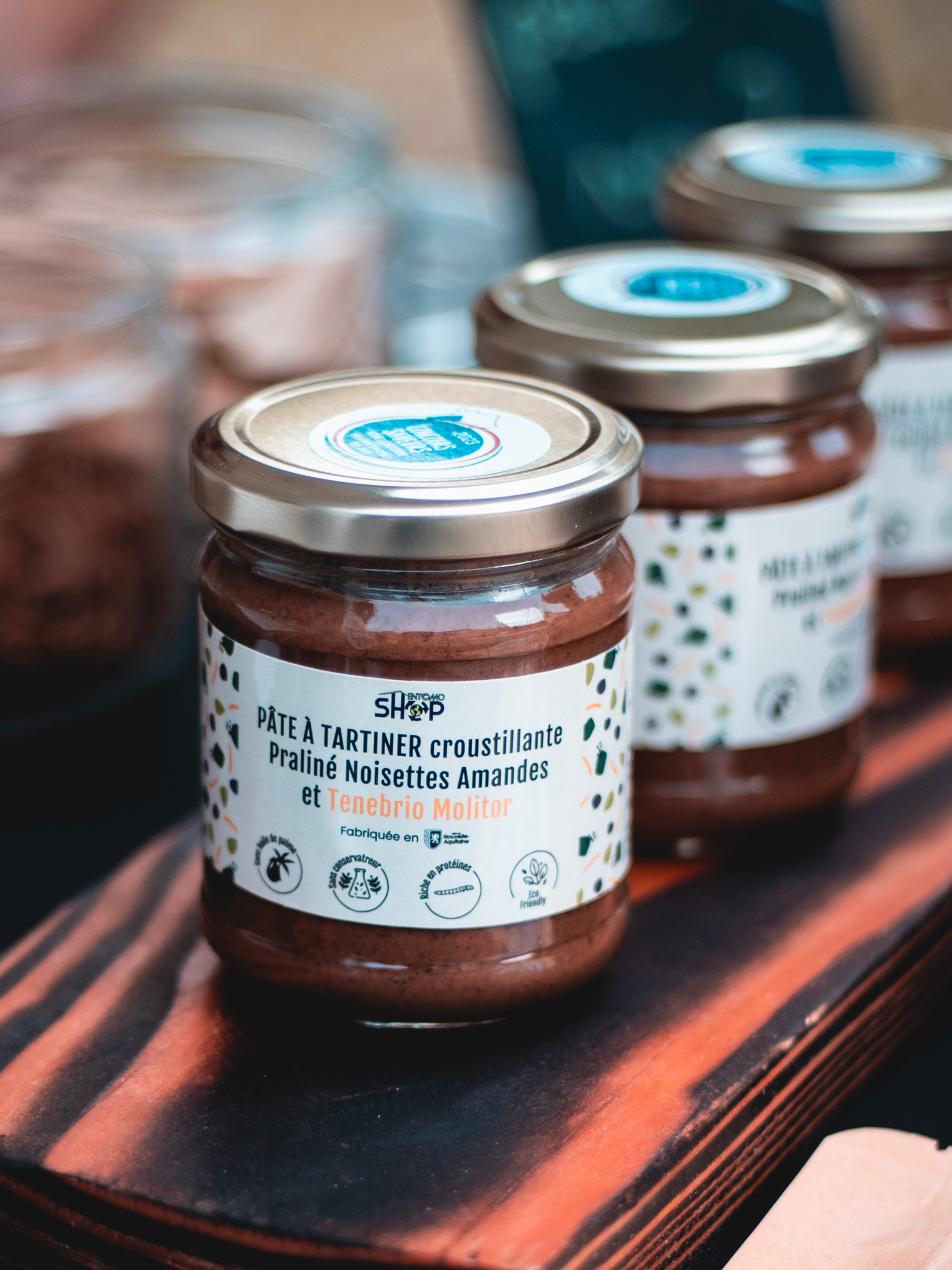 Fabriquée en Gironde, en collaboration avec un confiseur chocolatier, cette pâte marie noisettes du Lot-et-Garonne, amandes et chocolat au lait, avec une texture crunchy apportée par les insectes.