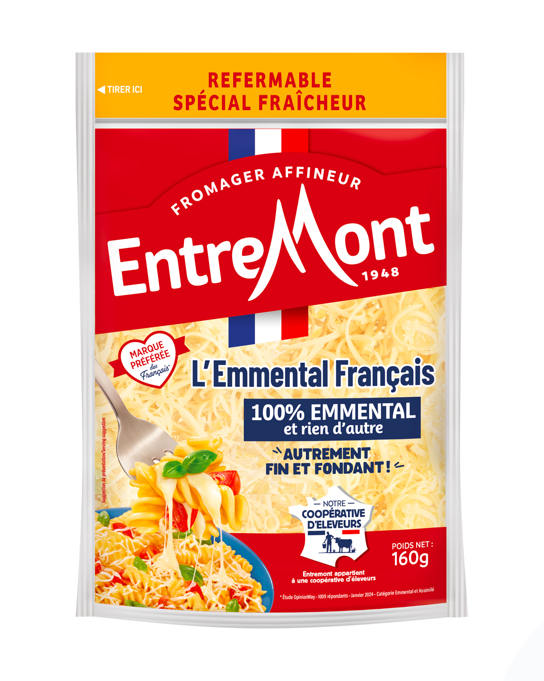 L’Emmental râpé, sacré « préféré des Français » selon une étude OpinionWay, se dévoilera dans un habillage visuel plus impactant, avec un logo plus lisible et un design qui valorise clairement l’origine et la composition du produit.