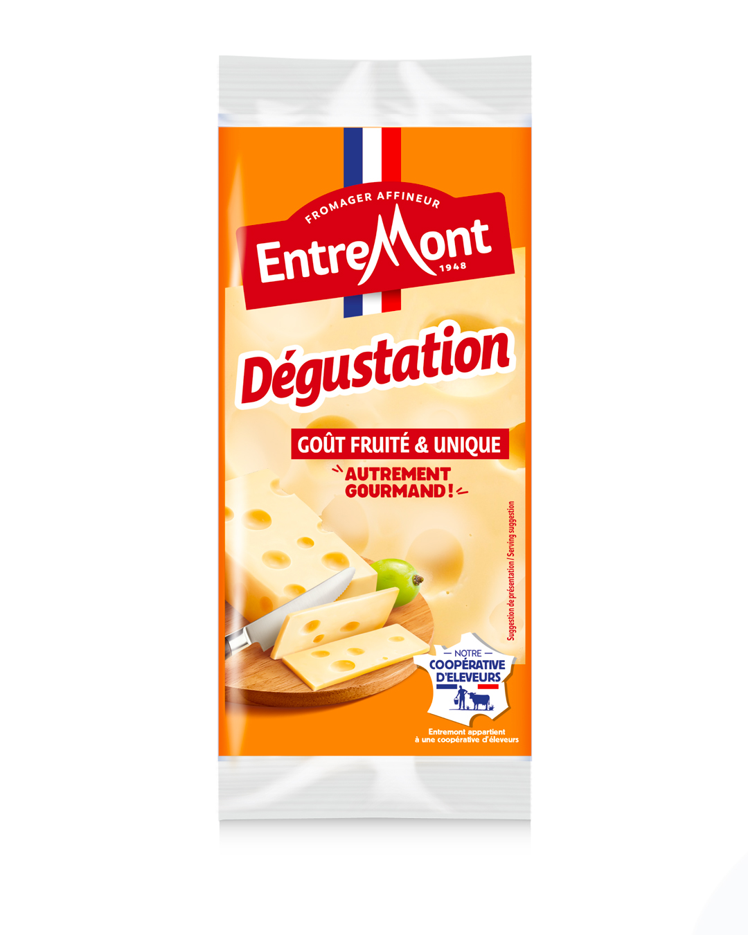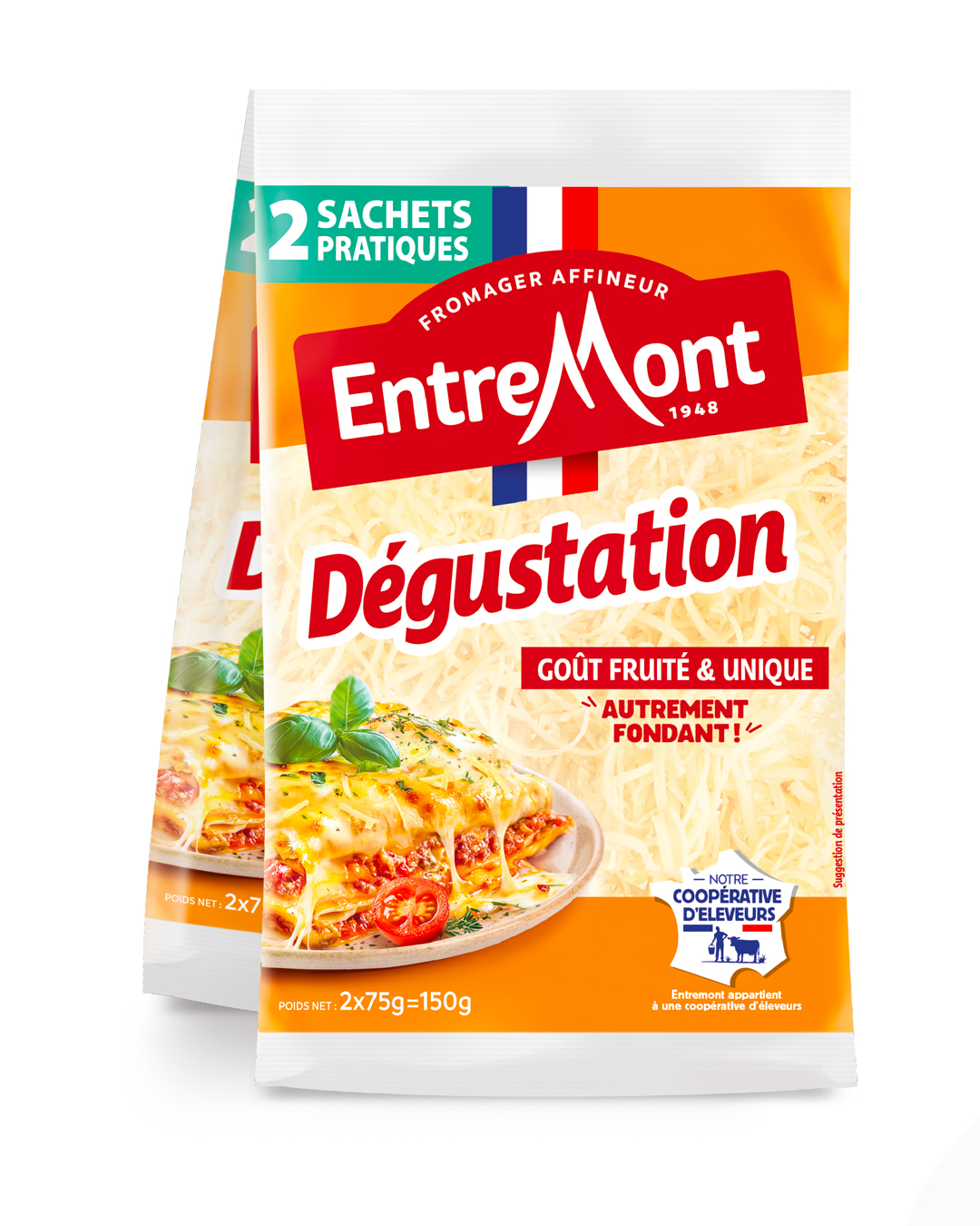 Sans fécule ajoutée, composé à 100 % d’Emmental et fabriqué à partir de lait français, ce fromage reste fidèle à une recette transmise depuis 1948.