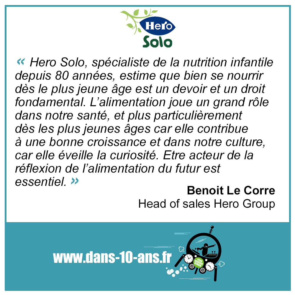 « Hero Solo, spécialiste de la nutrition infantile depuis 80 années, estime que bien se nourrir dès le plus jeune âge est un devoir et un droit fondamental. L’alimentation joue un grand rôle dans notre santé, et plus particulièrement dès les plus jeunes âges car elle contribue à une bonne croissance et dans notre culture, car elle éveille la curiosité. Pour Hero Solo, être acteur de la réflexion de l’alimentation du futur est essentiel. » Benoit Le Corre, Head of sales Hero Group