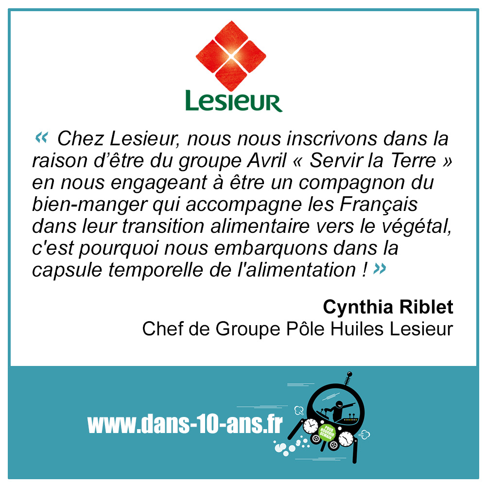 « Chez Lesieur, nous nous inscrivons dans la raison d’être du groupe Avril « Servir la Terre » en nous engageant à être un compagnon du bien-manger qui accompagne les Français dans leur transition alimentaire vers le végétal, c’est pourquoi nous embarquons dans la capsule temporelle de l’alimentation ! » Cynthia Riblet, Chef de Groupe Pôle Huiles Lesieur