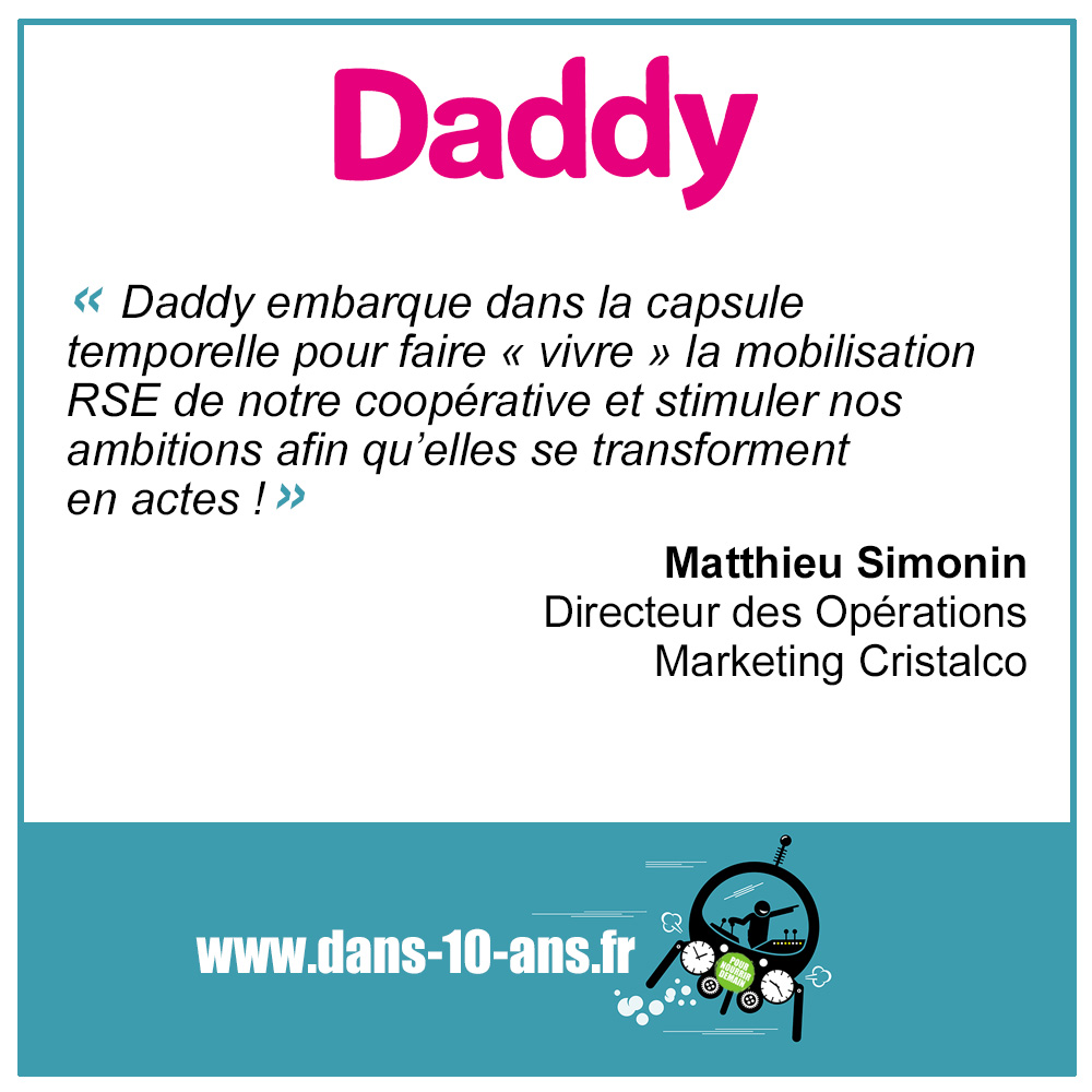 « Daddy embarque dans la capsule temporelle pour faire « vivre » la mobilisation RSE de notre coopérative et stimuler nos ambitions afin qu’elles se transforment en actes ! » Matthieu Simonin, Directeur des Opérations Marketing Cristalco