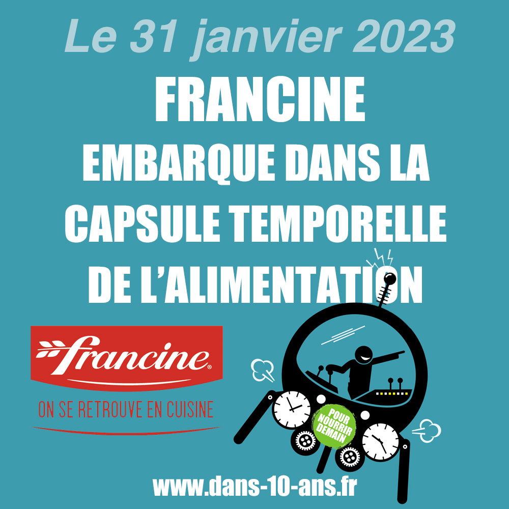 Le 31 janvier 2023, Francine va embarquer dans la capsule temporelle de l’alimentation afin de promouvoir auprès des médias et des consommateurs sa vision de l’alimentation et de l’agro-alimentaire dans 10 ans.