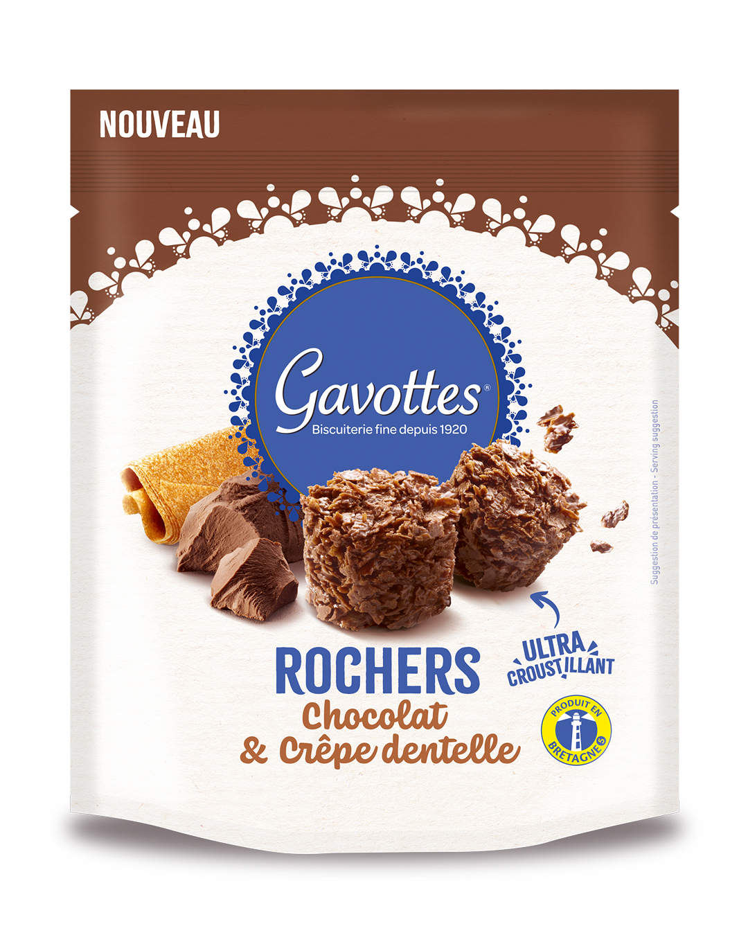 Dans un autre registre, les rochers croustillants mêlent éclats de Crêpe Dentelle et chocolat au lait, dans un format Doypack pensé pour les pauses partagées.